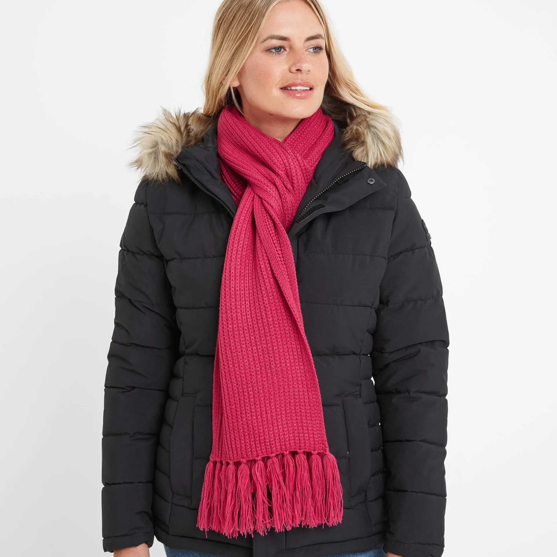 Black November EventGet an extra 15% off this product – automatically applied at checkoutCannot be used in conjunction with any other discountsProduct DescriptionChunky, warm and cosy, our Hanlith scarf is knitted in a soft-to-the-touch ribbed texture and makes the perfect finishing touch to any autumn or winter outfit. This versatile scarf is long enough to wrap around your neck several times to keep the chill out on blustery days and has playful tassels at each end. Designed in West Yorkshire, Hanlith comes in warm colours inspired by moorland berries and you’ll find our signature Yorkshire Rose TOG24 woven label at one end. When you’re searching for the ideal gift for any occasion, look no further.FeaturesChunky knitted scarfSoft-to-the-touch ribbed textureTassel fringe at both endsWoven Yorkshire Rose TOG24 label at one endFitMaterial Composition100% Acrylic.CareMachine washable.