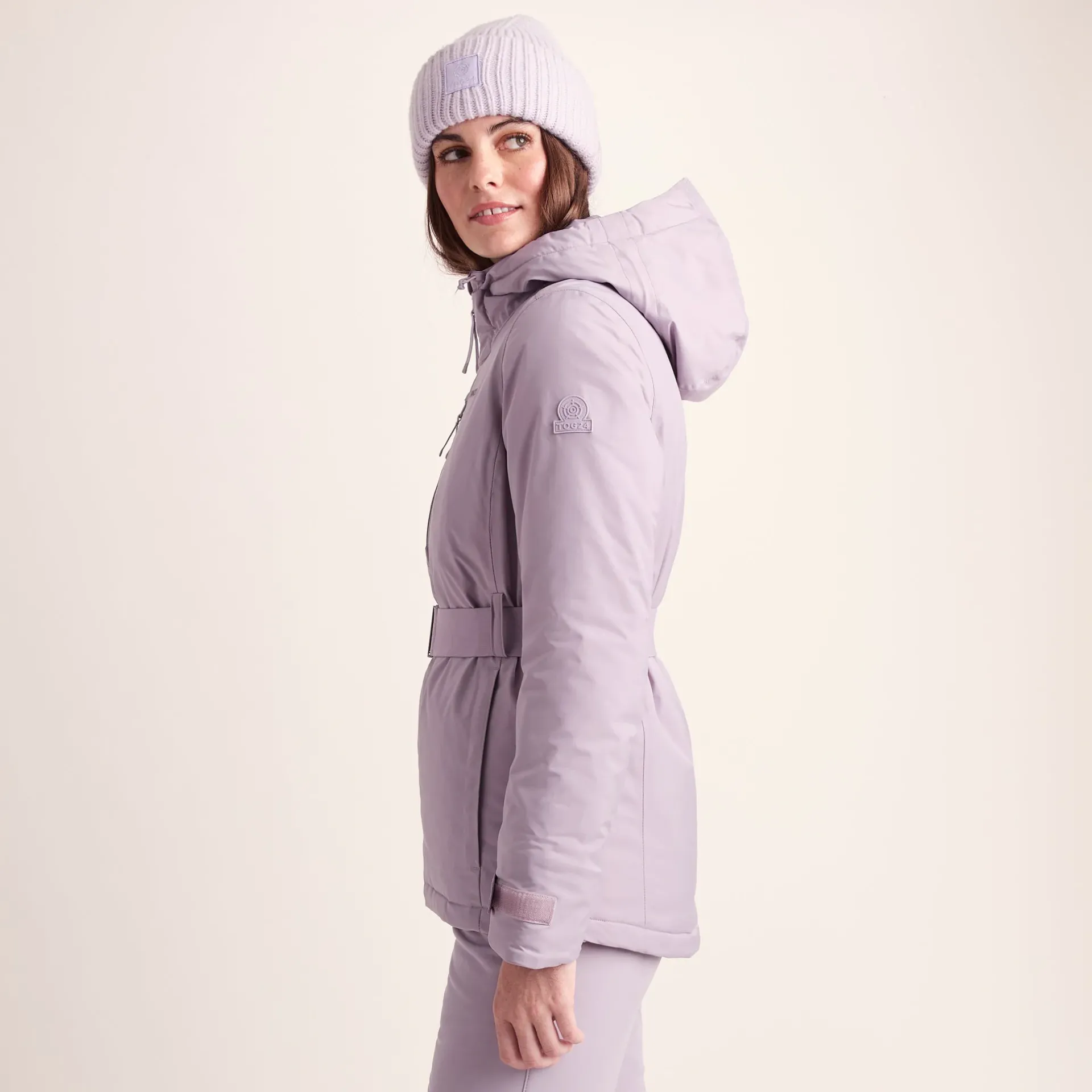 Product DescriptionReady to tackle those snow-covered mountains in style? The Meribel women’s ski jacket has you covered from first lift to last run. With impressive 20K waterproofing and 20K breathability, this women’s snow jacket keeps you dry and comfortable no matter the weather.nThe flattering hourglass design with a removable waist belt gives you two stunning looks in one – cinched for apres ski, or straight for performance. Inside the Meribel women’s snow jacket, the warm quilted lining and fully taped seams trap heat while keeping moisture out, and the DWR coating means snow and light rain simply roll off.nWhen the wind picks up, you’ll appreciate the fixed hood with its shaped peak and handy toggle adjusters that keep your vision clear for those perfect turns. The waterproof zip with glove-friendly puller means no more fumbling at the chairlift, while chunky easy-grab cuff adjusters let you seal the snow outside of this coat in seconds.nThe Meribel women’s ski coat has no shortage of storage, wiFeaturesWaterproof (20K), Breathable (20K), and WindproofWarm quilted liningFully taped seamsWater repellent coating (DWR)Removable u0026amp; adjustable waist beltFixed hood with shaped and fused hood peakFull length wp zip with glove-friendly pullerToggle adjusters to hood and hem1 chest zip pockets, 2 Lower zip pockets, 1 sleeve zip pocket for ski passChunky easy grab cuff adjustersSki features include; snow cuffs, 1 inner mesh goggle pocket, ski goggle wipe, glove ringSnowskirt has a gel print on the edge for grip and a DWR finish – this is not removeable.TOG24 badge on sleeve u0026amp; raised logo print on chestFitStudio model Gina Dress 8/10 uk Height 5’11* Bust 34c Waist 26.5