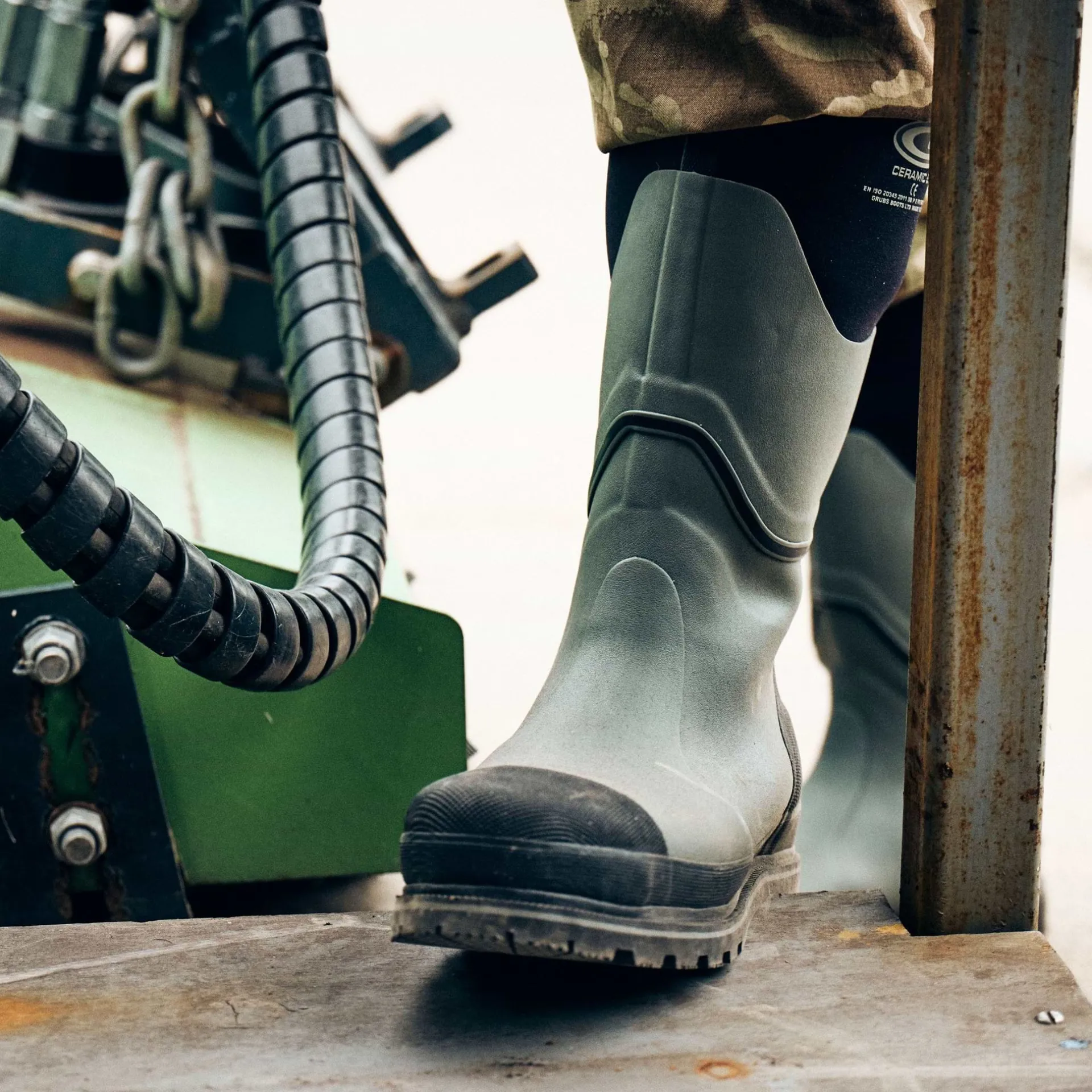 Product DescriptionGrubs CERAMIC 5.0 S5⢠is the world’s first rubber safety boot that uses non-metallic materials. This means it conducts neither cold nor electricity making them popular in a wider field of safety footwear. FeaturesCERAMIC SAFETY TOE – complies with BS EN ISO 203450 S5 without cold absorbing/ emitting metal materials. DEFENDERâ˘, 5mm Ballistic insole – lightweight and flexible whilst passing both BS EN ISO 20344: 2004 5.8.2 penetration standard and BS EN ISO 20344: 2004 5.9 flex resistance, without the cold of Steel. 5MM INSUFOAM-ULTRA⢠NEOPRENE WITH CALF HEIGHT RUBBER – all round foot comfort and warmth. 4mm rubber over the whole foot area makes it highly resistant to puncture and flex cracking. 6mm NITROCELL⢠footbed – provides a soft cushioning for an athletic shoe feel. A million microscopic nitrogen bubbles that insulate the wearer from cold surfaces. TREDZâ˘(DURAPRENEâ˘rubber) outsole – superior grip on a variety of surfaces, the tread is designed to work with the action of the foot, is oil resistant and passes TM144: 1999slip resistance test. COMFORT RATING – -20Âşc to +20ÂşcFitMaterial CompositionUpper: 70% Rubber 30% Nylon; Inner: 100% POLYESTER; Sole: 100% RubberCareBRUSH ME, WASH ME: Hose down your wellies after each use and once a month wash off excess dirt with just water and for a deep clean use water with a mild soap. Gently scrub with a soft bristle brush until your boot is clean, then leave the boots to dry naturally (not on a direct heat source).