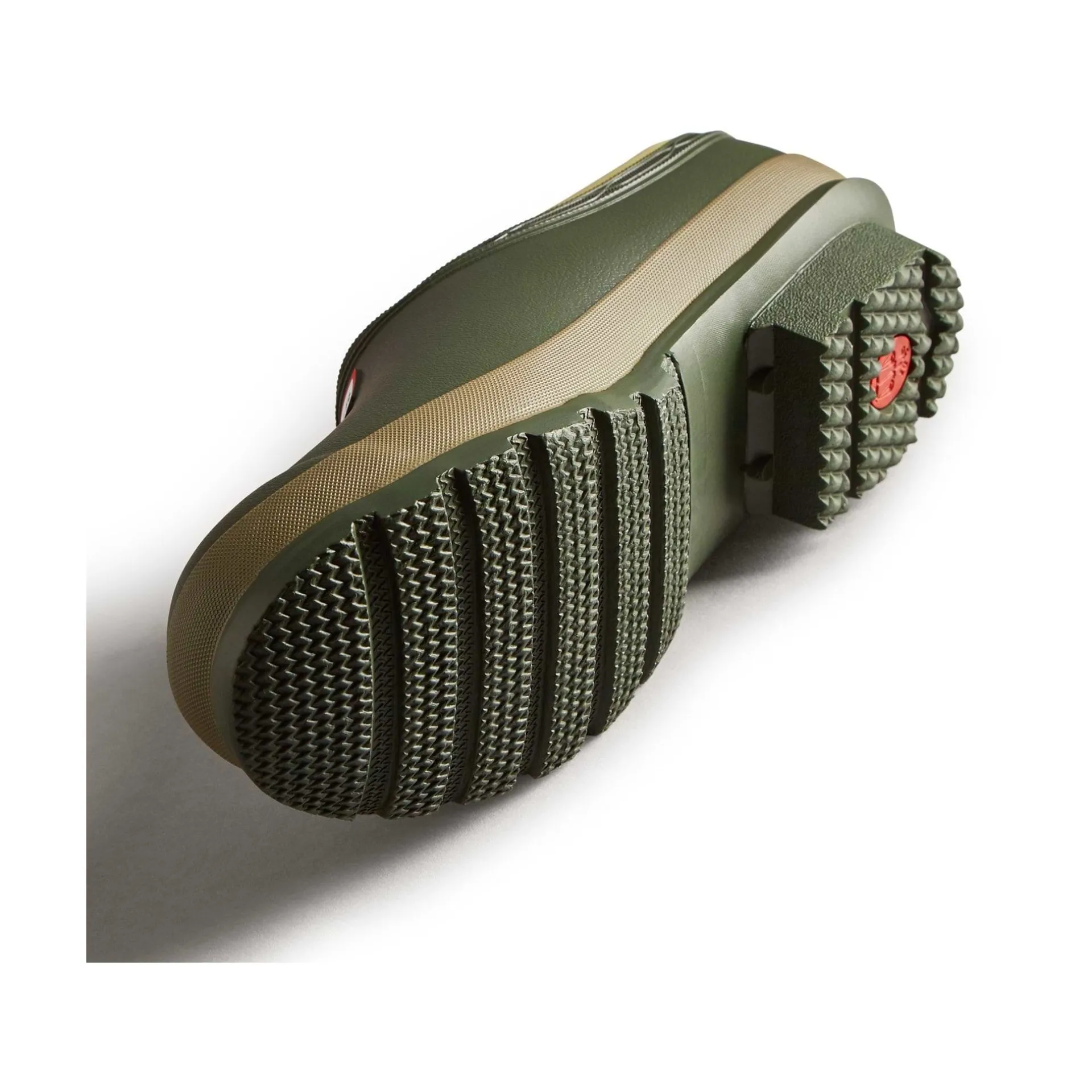 Product DescriptionA dark green slip-on shoe handcrafted from waterproof vegan rubber, designed for gardening. Updated with the iconic red box logo, the clog has a flexible natural rubber form and Hunter’s signature tread providing grip.FeaturesCertified veganWaterproofHandcraftedNatural rubber construction with matte finishNeoprene liningSignature calendered treadFitMaterial CompositionUpper: 100% Rubber. Lining: 100% Polyester. Sole: 100% RubberCare