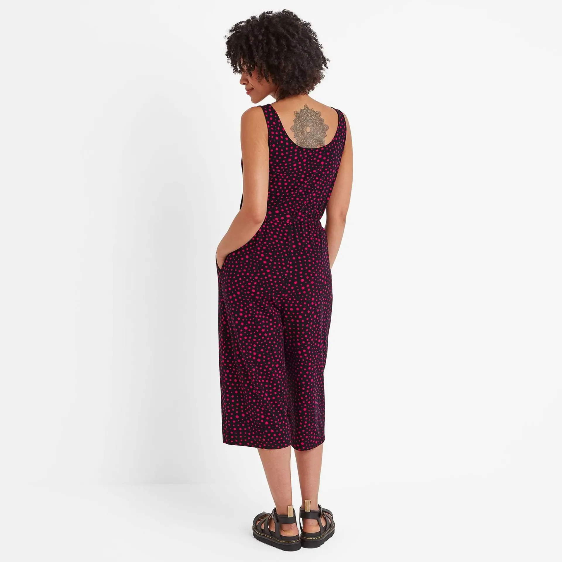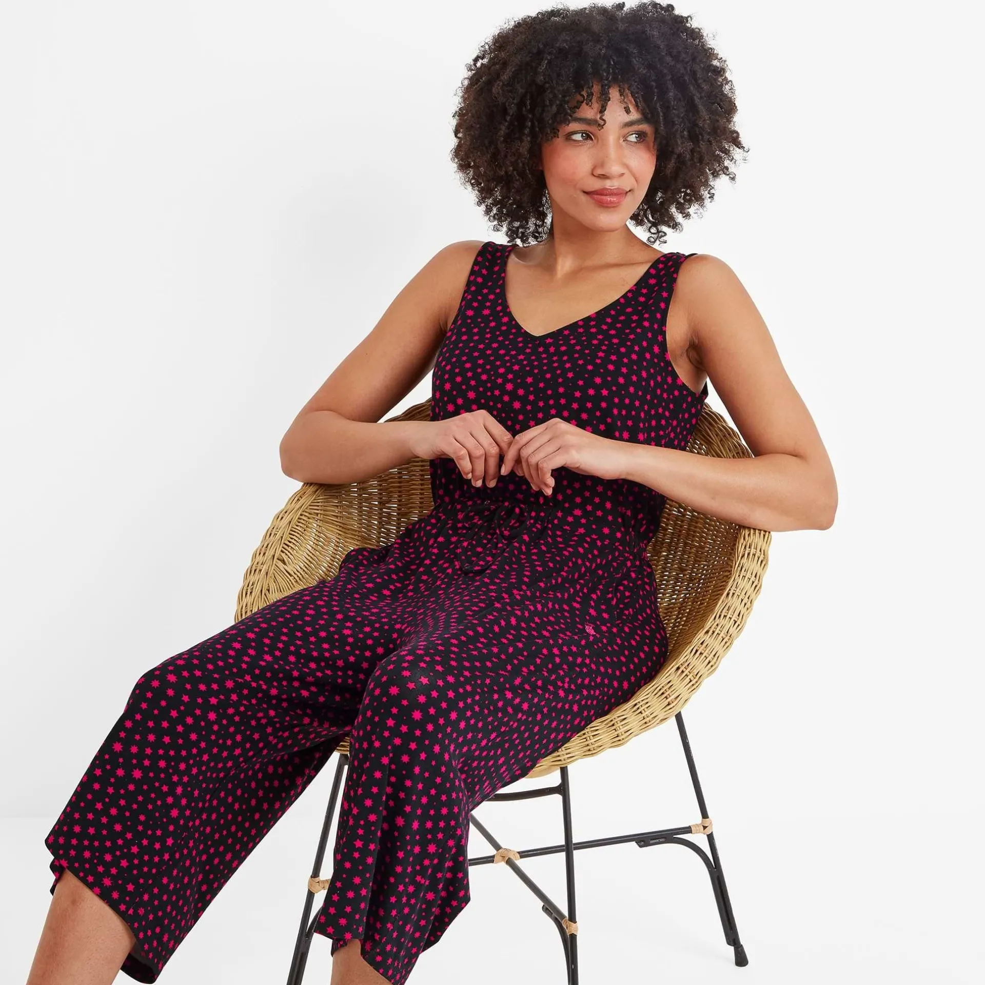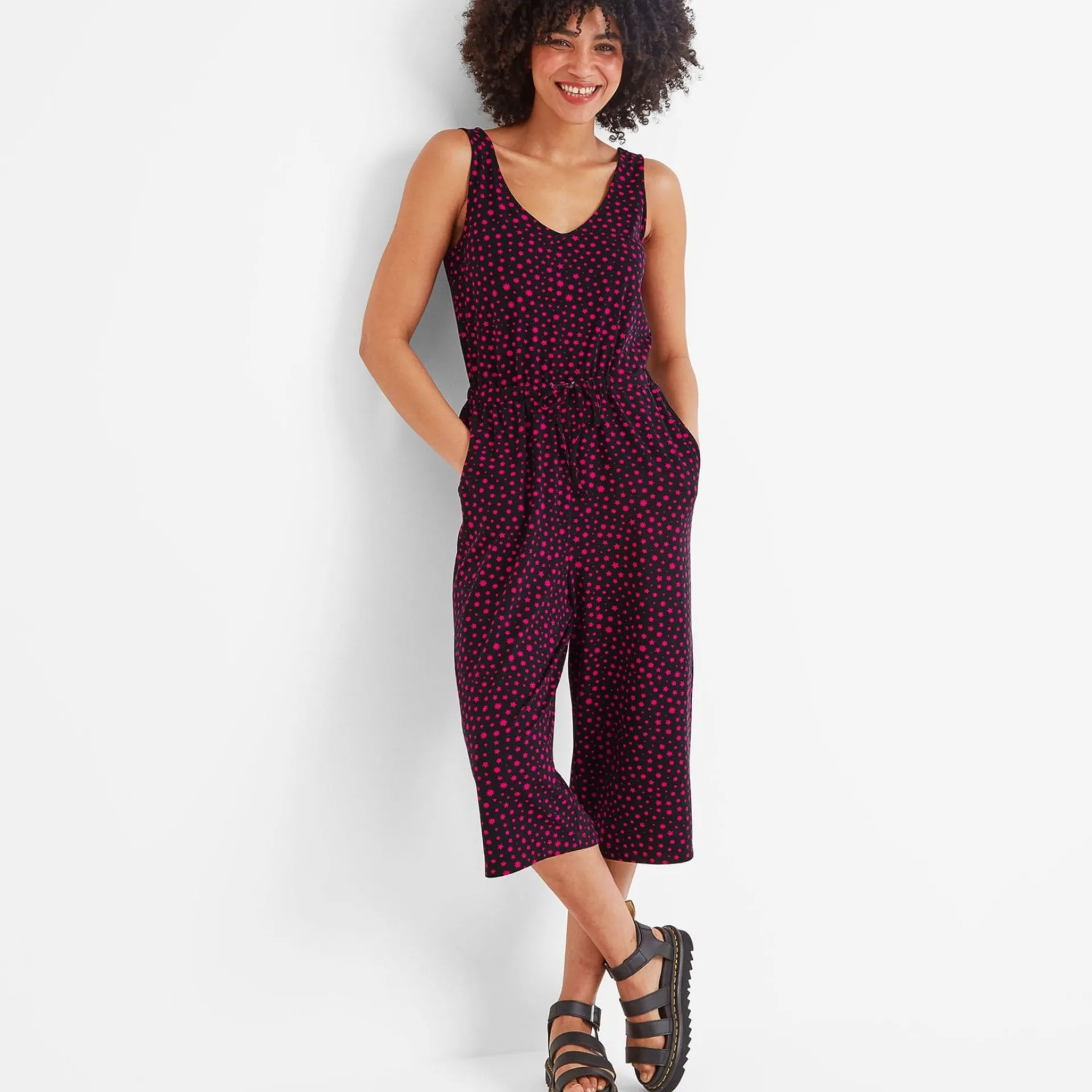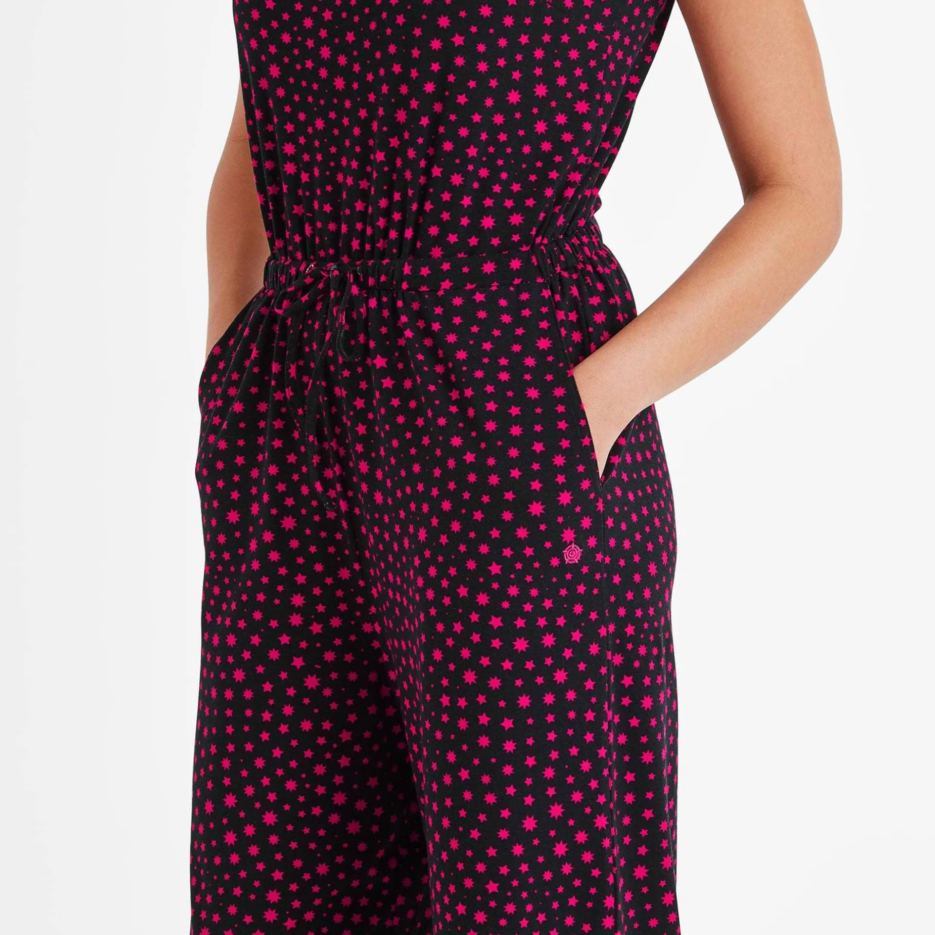 Clearance*This product is excluded from all additional promo code discountsProduct DescriptionOur Emmie Jumpsuit is made from super soft jersey fabric with a scooped neckline and darts for a tailored fit. It also has an elasticated waist, wide legs and drawcord that helps you get the right fit for you along with practical pockets to carry your essentials.FeaturesSupersoft jersey jumpsuitScooped neck lineBust dartsElasticated waist with drawcord2 hip pocketsCropped jumpsuit with wide legsLogo embroidery below pocketFitStudio model Natasha is wearing size 8 and is 5’10