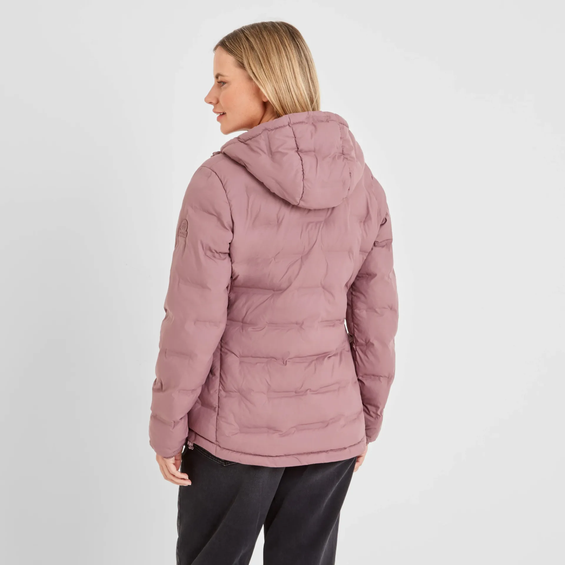 Product DescriptionThe Palmer womenâs padded jacket is all about warmth and style. With sleek heat-sealed baffles designed to lock in warmth, it features a modern, stepped pattern that keeps you looking great and feeling cosy on those chilly days. The insulation, made from recycled plastic bottles, and a durable water-repellent finish makes light rain roll right off, so drizzles wonât slow you down. Perfect for tackling brisk winds or layering up on damp days, the Palmer has rubberised toggle adjusters at the hood and hem, letting you get the perfect fit and keep out the chill. Itâs practical, too, with a full zip front and two lower zip pockets to safely stash your essentials. Built to handle everything from morning errands to weekend adventures, this wind-resistant jacket is finished with TOG24 badge.FeaturesLIGHT RAIN PROTECTION, WIND RESISTANT AND WARMWATER REPELLENT COATING (DWR)HEAT SEALED BAFFLESZIP OPENING ON FRONTTOGGLE ADJUSTERS ON THE HOOD OPENINGTOGGLE ADJUSTERS ON THE HEM2 LOWER ZIP POCKETSTOG24 BADGE ON SLEEVEFitStudio model Izzy Dress 8 UK, Height 5’7
