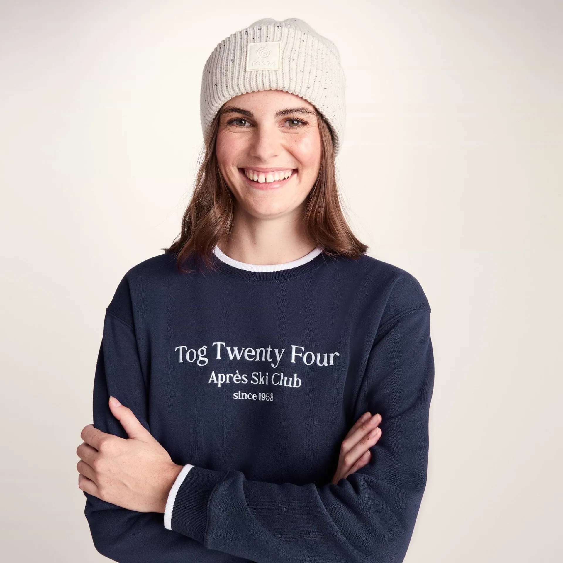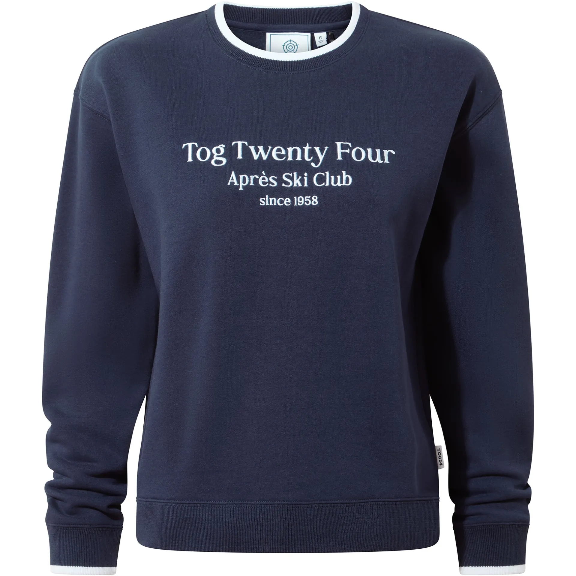 Product DescriptionLooking for that cosy combo of warmth and après ski chic? The Peggy sweatshirt has you covered. This supremely soft crew neck sweater is your new best friend, whether you’ve been out braving the cold or you’re just settling in for a lazy weekend.nThe magic happens the moment you slip it on – that brushed-back inner feels absolutely heavenly against your skin, wrapping you in warmth that you’ll never want to take off. This sweatshirt is cut in a fashionable boxy fit with dropped shoulders that give you a cool, relaxed vibe while flattering your figure.nThe contrast tipping on the neck and cuffs adds a sporty little twist, with just the right pop of white to lift the look. The après ski embroidery on the chest announces your mountain-ready style, whether you’ve actually hit the slopes or just want to look like you have!nnFinished off with comfy ribbed cuffs that help it keep its shape, the Peggy sweatshirt is easy to throw on with jeans, leggings, or even over a casual dress. Cosy, flatFeaturesSupersoft brushed back crew neck sweatContrast tipping to neck and cuffsApres Ski embroidery to chestDropped shoulderRib neck, cuffs u0026amp; hemTOG24 label in the side seamFitStudio model Gina Dress 8/10 uk Height 5’11* Bust 34c Waist 26.5