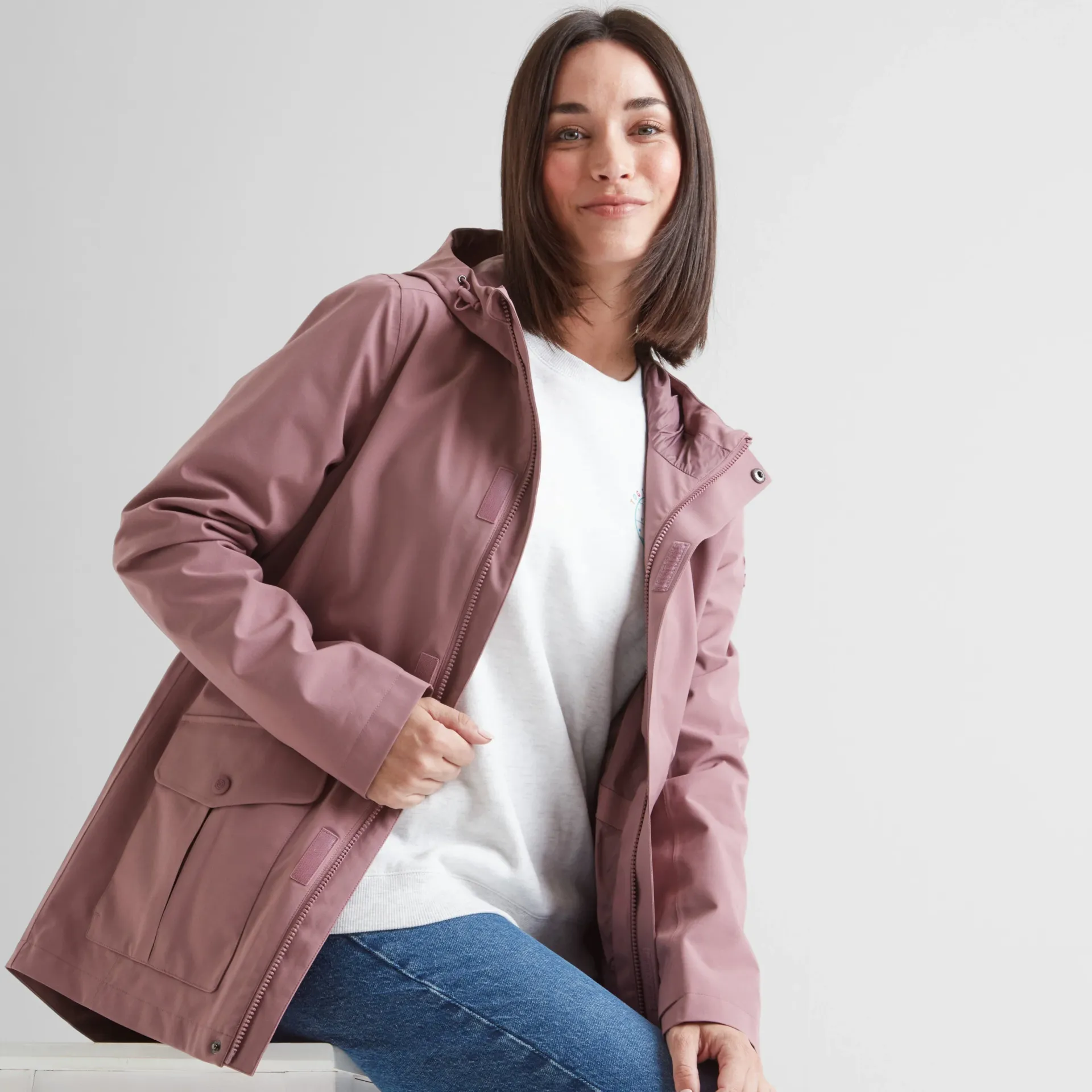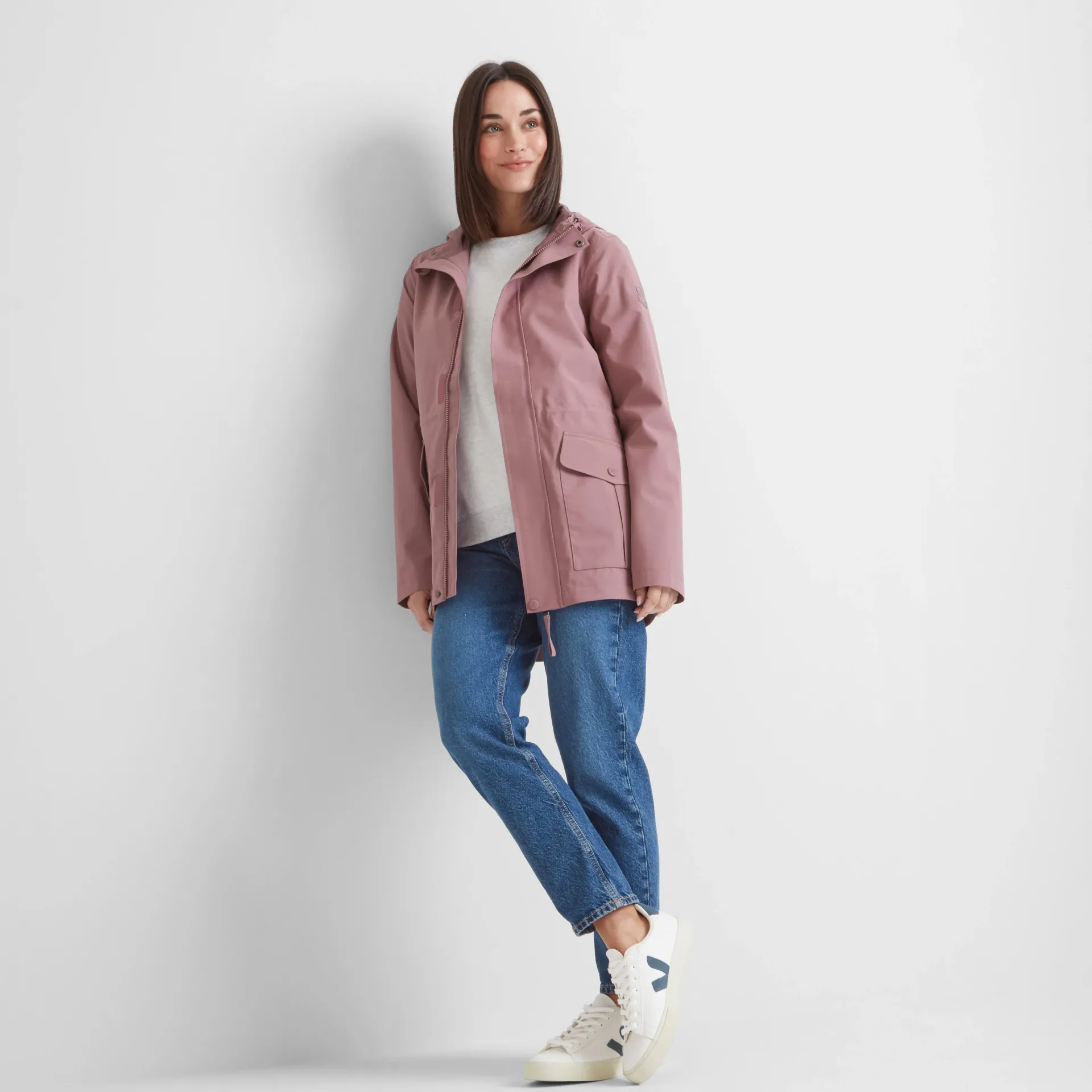 Product DescriptionOur Burradon womens waterproof jacket is designed to be your everyday waterproof companion. This jacket will keep you dry in all but the heaviest rain. There are plenty of handy places to stash stuff; on the outside, there are two angled patch pockets plus there’s a pocket on the inside. Also windproof, it’ll keep the breeze out even when it’s really blustery. Layered over a hoodie or jumper for extra cosiness.Features Waterproof (10K), Breathable (10K), and WindproofFully taped seamsWater repellent coating (DWR)Zip opening fastened with press studs u0026amp; velcro Toggle adjusters on the hood openingPress stud adjuster on the back of hood2 Lower patch pockets with side entry u0026amp; 1 inner zip pocketPress stud cuff adjustersToggle adjusters on the inner waistTOG24 badge on sleeveFitStudio model Georgia Dress 8 UK, Height 5’10