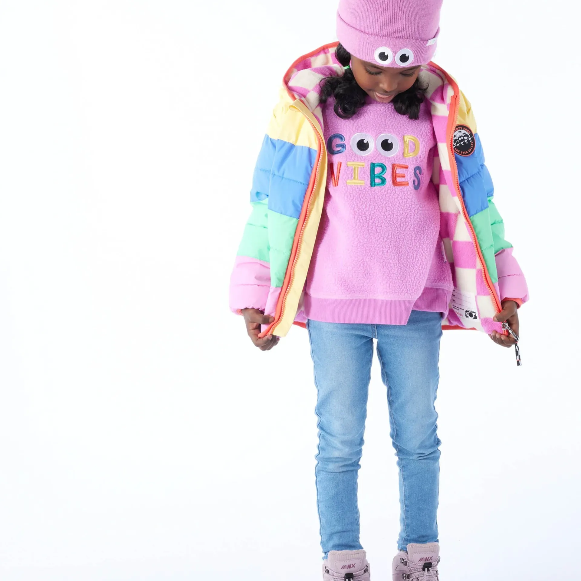 Product DescriptionWhen thereâs a little nip in the air, keep your little one snug as a bug in a rug with the Swaledale sherpa fleece jumper. Part of the TOG24 X Shaun the Sheep collaboration, this super cosy childrenâs fleece jumper is perfect for outdoor adventures and non-school uniform days, or even just relaxing at home watching an episode of everyoneâs favourite sheep! Made from thick, soft Sherpa fleece, this kidsâ fleece jumper, featuring a âGOOD VIBESâ embroidered graphic in vibrant print (complete with googly eyes!) is designed to keep little torsos comfortably toasty. The classic crew neck style is easy to wear, while the ribbed neck, cuffs and hem provide a snug and comfy fit, and the Shaun the Sheep woven label on the hem gives it extra character. Warm and welcoming, itâs the perfect layer for little mischief-makers.FeaturesTOG24 X Shaun the Sheep collaborationCrew neck sherpa fleece jumperRib neck, cuffs u0026amp; hemEmbroidery on the chestShaun the Sheep woven label on hemTOG24 woven label at side seamFitMaterial CompositionBody:100% PolyesterCareMachine wash at 30c, Do not bleach, Do not tumble dry, Cool iron, Do not dry clean, Wash with similar colours, Specific care instuctions can be found on your garment care label