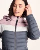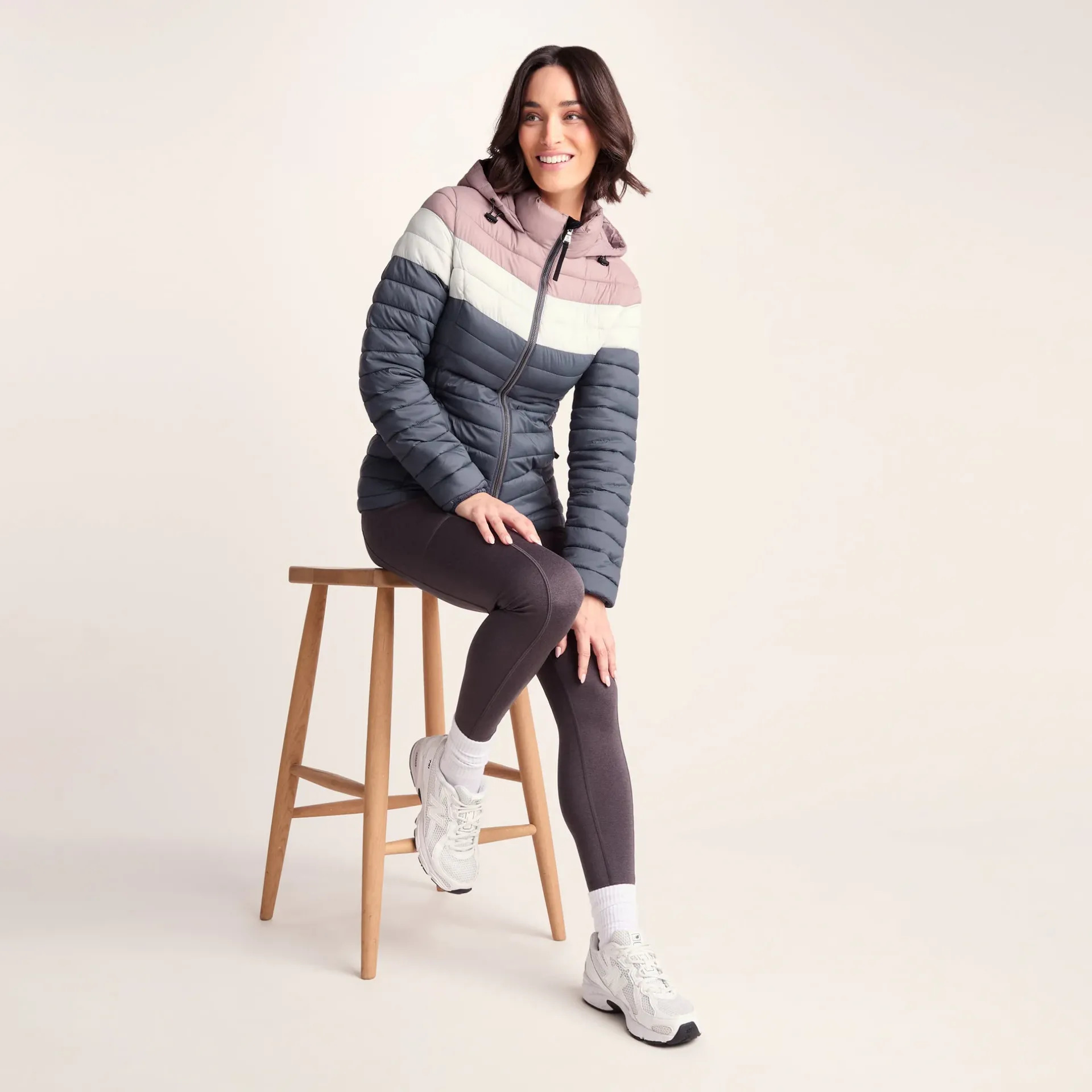 Product DescriptionLightweight, wind resistant and buttery soft, our Garriston quilted jacket gives you warmth without adding bulk and is designed in bold, chevron colour blocks inspired by moorland heather and the churning Atlantic sea. This distinctive and versatile jacket is perfect for travel as it squishes down small and springs back into shape when you need it. The thermal filling is made from recycled plastic bottles, so you’ll be doing your bit to protect the environment too. Garriston has a cosy inner collar for added comfort and a fixed, insulated hood with toggle adjusters. There are two handy zip up pockets and a full length, easy pull zip at the front. The finishing touch is our iconic embossed rubber Yorkshire Rose badge on the sleeve.FeaturesWarm, lightweight and wind resistantQuilted in supersoft materialThermal filling made from recycled plastic bottlesChevron colour block designFull length exposed zip2 lower zip up pocketsInner collar for added comfortInsulated hood with toggle adjustersElasticated cuffsEmbossed rubber TOG24 badge on sleeveFitStudio model Mayara is wearing size 10 and is 5’10