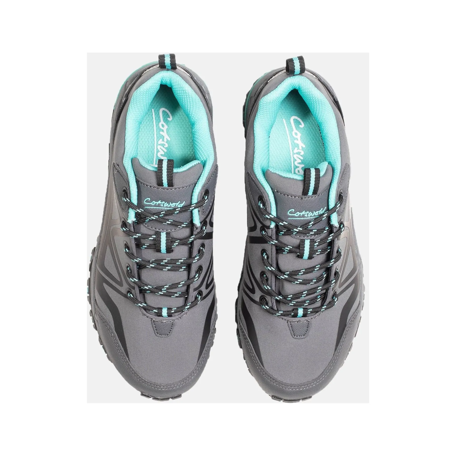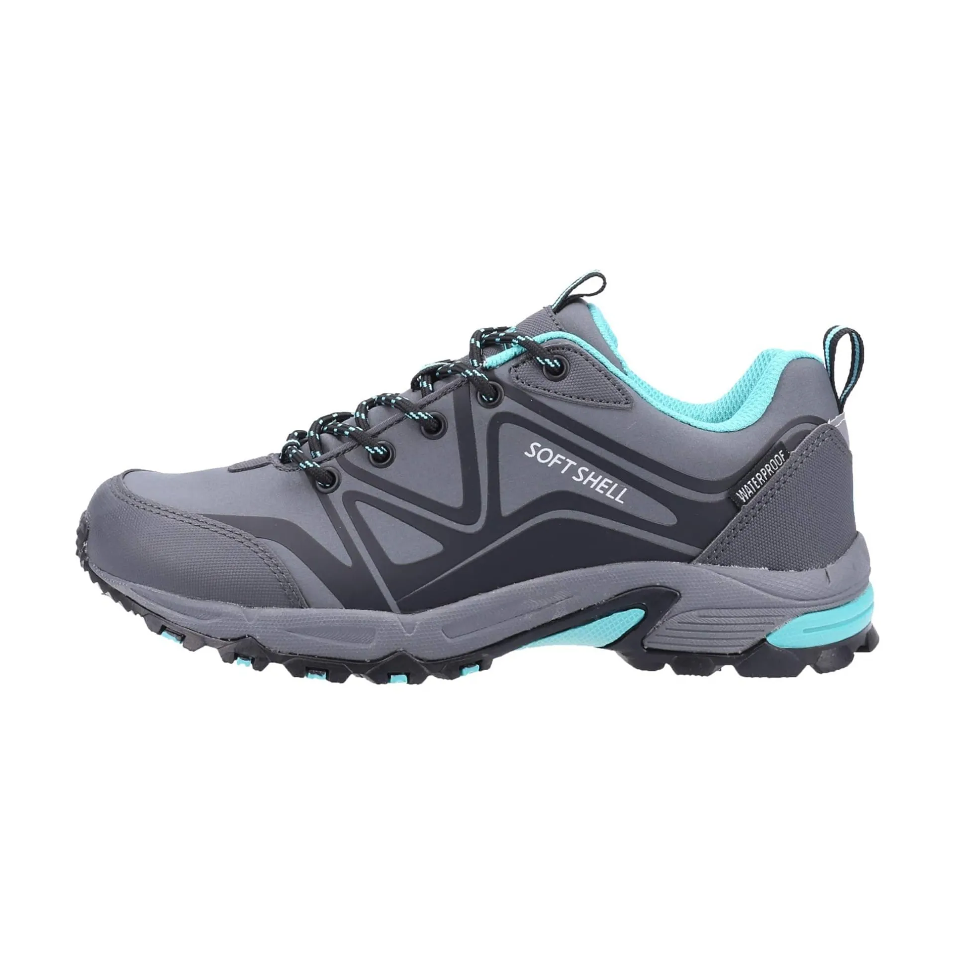 Product DescriptionLightweight and breathable hill and trail walking hiking shoe. A waterproof membrane keeps feet dry whilst a memory foam foot bed moulds and cushions the feet, keeping adventurous feet comfortable.FeaturesLightweight, breathable and water resistant soft shell upperWaterproof inner membraneSoft touch liningRemovable memory foam foot bedPadded tongue with alignment loopDeep cushioned collarRear pull loopTraction rubber outsoleFitMaterial CompositionUpper: Softshell and PU. Lining: Waterproof Membrane/Mesh. Sole: Rubber.Care