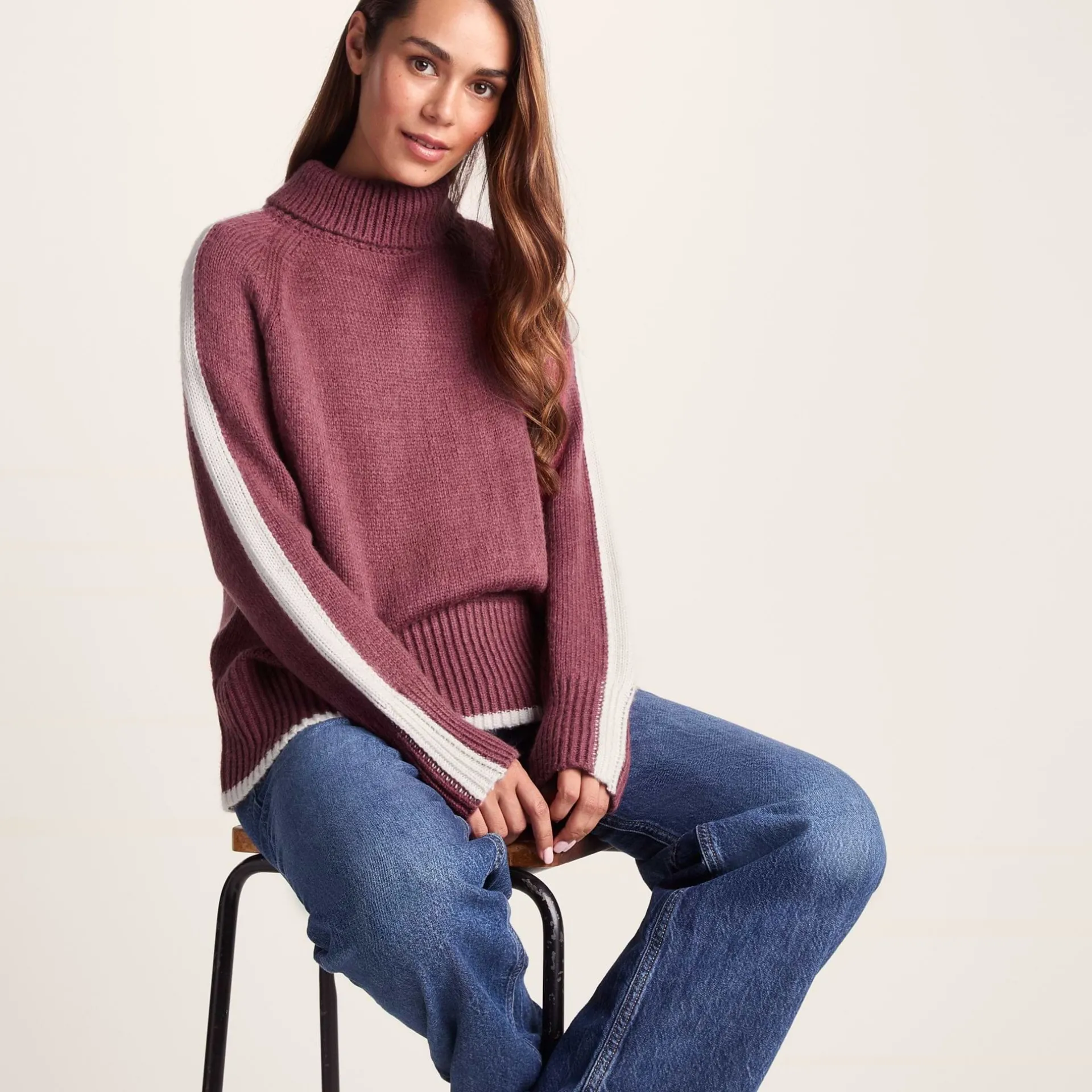 Product DescriptionSay hello to the Moira women’s sweater. Gone are the days of fidgeting with tight roll necks; thanks to a relaxed split opening at the back of the collar you can breathe easy while staying toasty and snug. The contrast colour stripe detail gives this women’s jumper a subtle pop, and thanks to the raglan sleeves, you won’t be fighting with this women’s jumper every time you throw a jacket on or off. Once you feel how soft this knitted jumper is, you’ll be finding excuses to wear it everywhere. The ribbed collar, hem and cuffs keep it all neat, and the relaxed fit means you’ve got room to layer. This women’s sweater is perfect for those days when comfort is non-negotiable, but you still want to look like you’ve made an effort. Layer it under your favourite coat or wear it solo – either way, the Moira women’s jumper has your back.FeaturesKnitted roll neck jumperContrast colour stripe detailRaglan sleevesRelaxed split opening to back of collarRib collar, hem and cuffsTOG24 woven label in the side seamFitStudio model Narine Dress 6 uk Height 5′ 6½* Bust 32 Waist 24