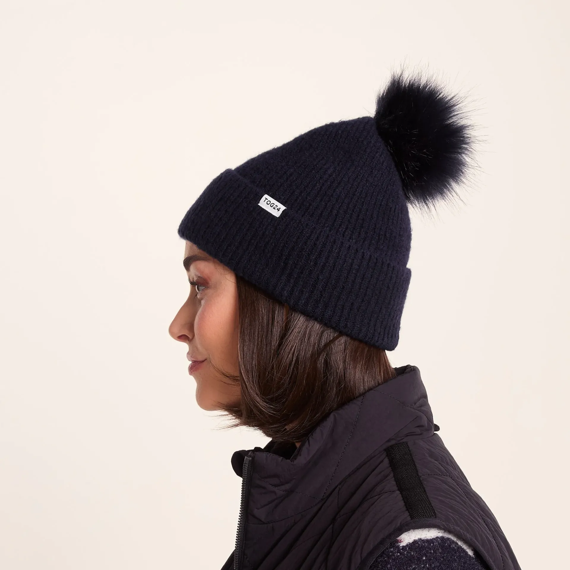 Black November EventGet an extra 15% off this product – automatically applied at checkoutCannot be used in conjunction with any other discountsProduct DescriptionSay hello to Anya knitted hat – your new winter go-to when the cold creeps in. Cosy, comfy and full of charm, this woolly hat is the winter essential you’ll be reaching for on repeat.rnThe chunky ribbed knit hugs your head in gentle warmth, like a hot brew on a frosty morning. The Anya beanie hat keeps the heat in and the chill out no matter what the forecast throws your way, with the turn-up fitting close to your ears for extra warmth where it matters most and holding its shape day after day.rnUp top, a faux fur pom pom brings a bit of cheer to grey skies – because practical doesn’t have to mean boring. Whether you’re mooching around a Christmas market or braving an icy school run, this woolly hat has got you covered.rnFinished with a subtle TOG24 badge on the turn-up, this knitted hat pairs easily with anything in your cold-weather wardrobe. Just pull it on, head out, and let the cold do its worst!FeaturesSupersoft rib knit hatFaux fur pom pomRib turn upTOG24 label on turn upFitStudio model Georgia Dress 8 uk Height 5’10* Bust 34 Waist 25.5