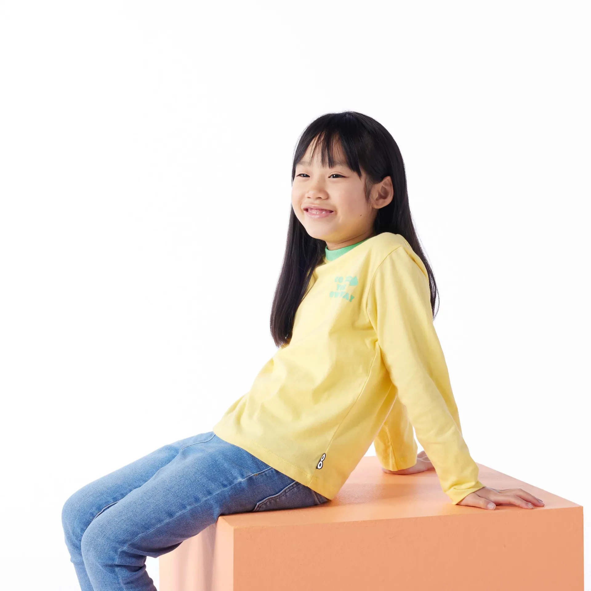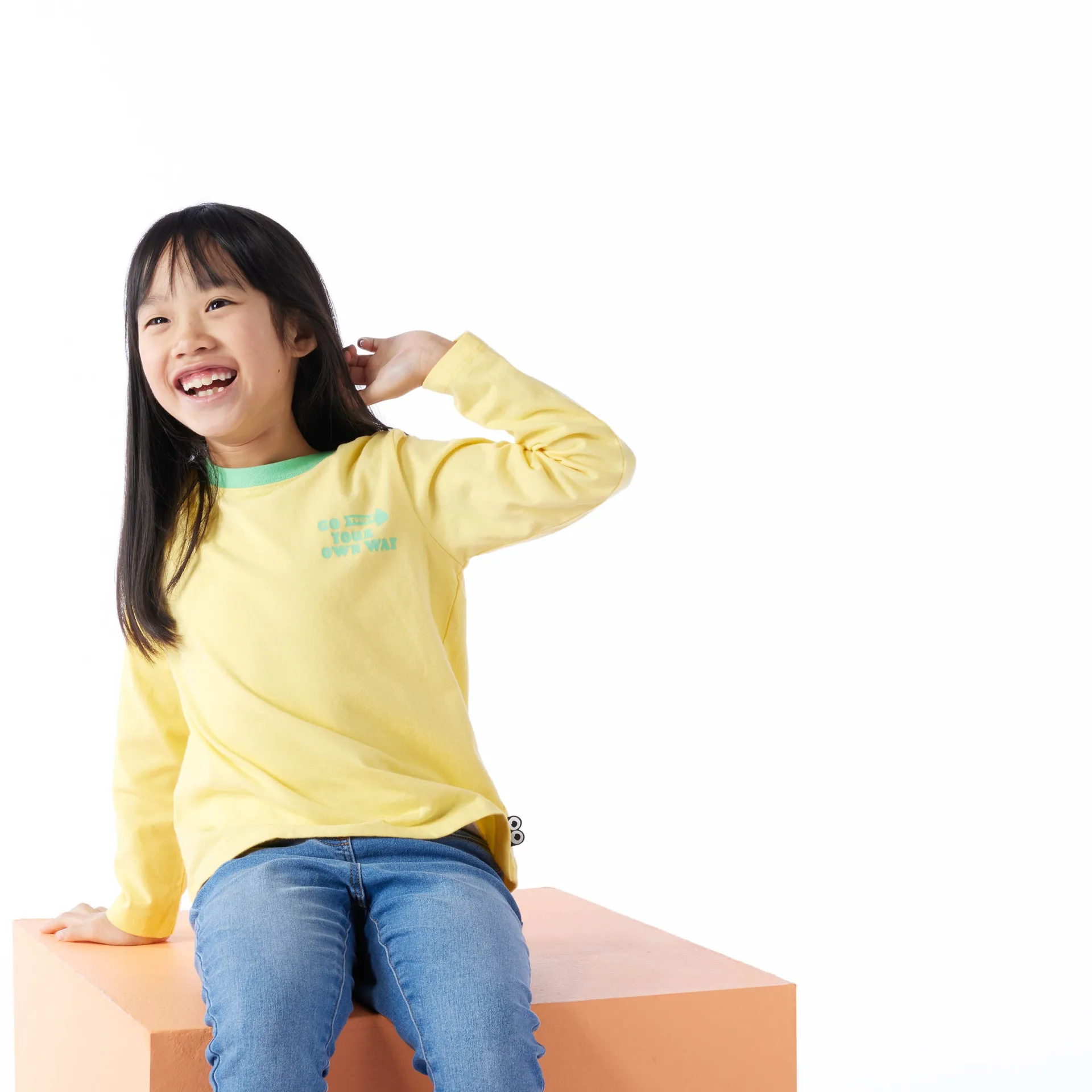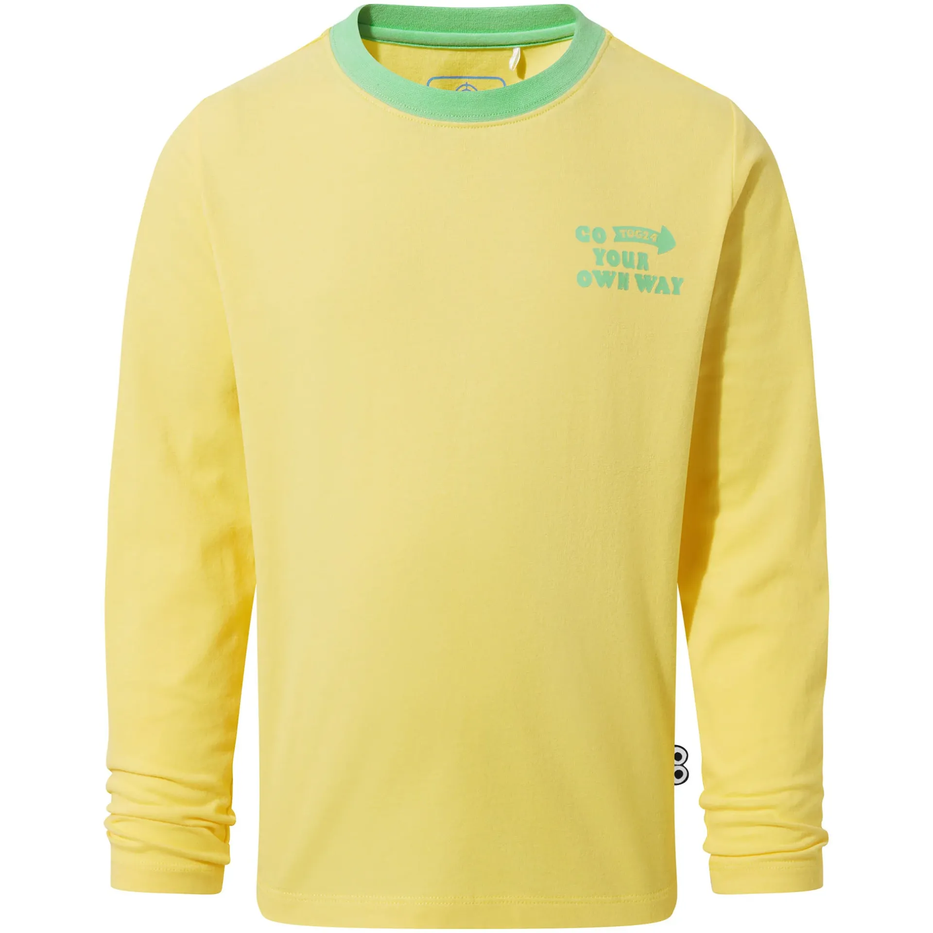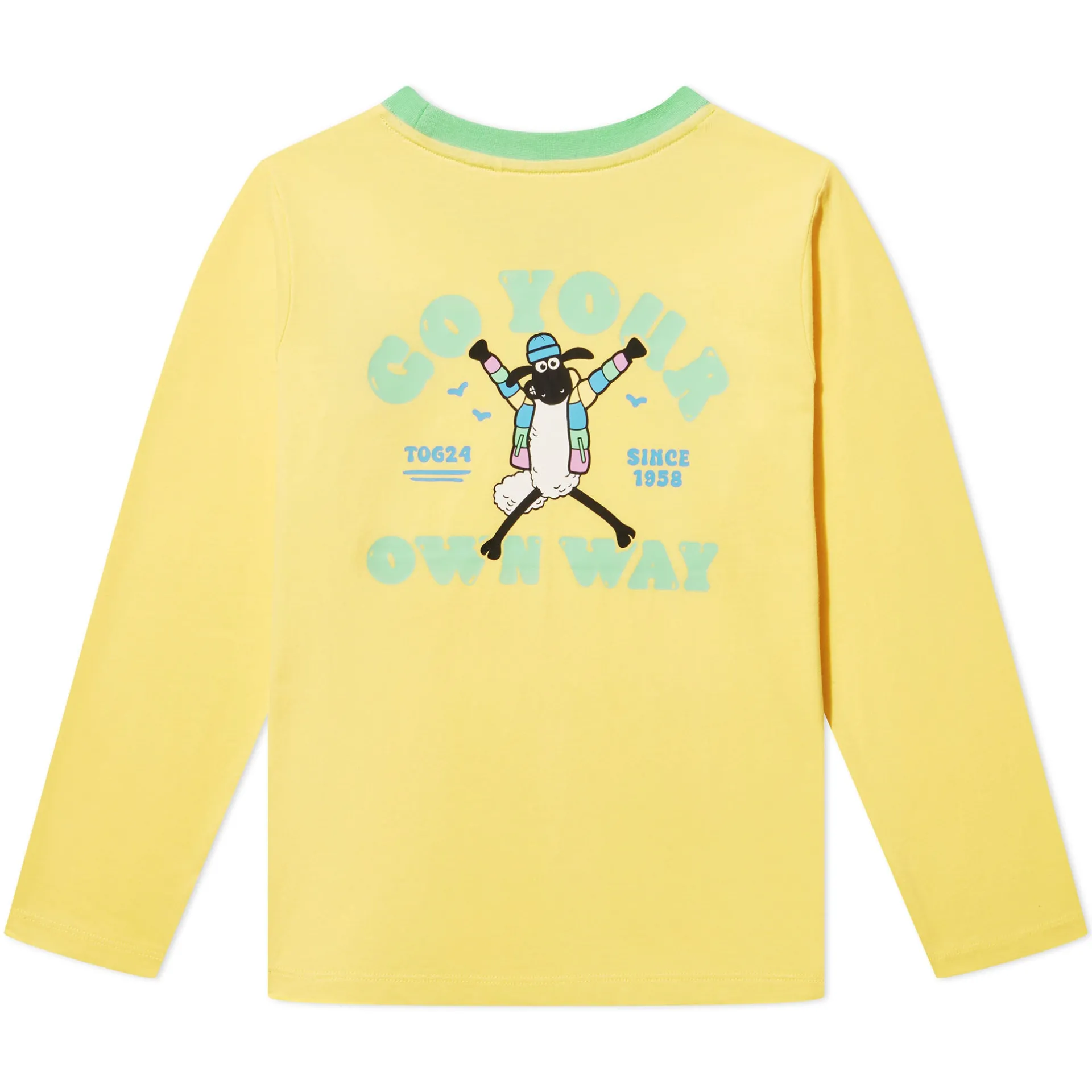 Product DescriptionnEncourage your little one to show their colours with the Ryeland kidsâ long sleeve jersey tee – part of the TOG24 X Shaun the Sheep collaboration. Made from soft, comfy jersey, this long sleeve top is perfect for kids who love playtime at pretty much any time â just like Shaun. The small Shaun the Sheep graphic on the chest keeps it subtle up front, but turn around and youâll find the real statement – a bold, contrast graphic on the back that proudly reads âGo Your Own Wayâ. Itâs a nod to those little lambs who love to stand out from the flock. Call it âFleecewood Macâ style, if you will. Finished with a woven Shaun the Sheep label at the side seam, itâs a tee thatâs made for kids who dare to do things differently.nFeaturesnTOG24 X Shaun the Sheep collaborationnLong sleeve jersey teenSmall graphic print on the chestnLarge Shaun the Sheep graphic on the backnShaun the Sheep woven label at side seamnFitnMaterial CompositionnBody:100% Cotton (Better Cotton)nCarenMachine wash at 30c, Do not bleach, Do not tumble dry, Cool iron, Do not dry clean, Wash with similar colours, Specific care instructions can be found on your garment care label