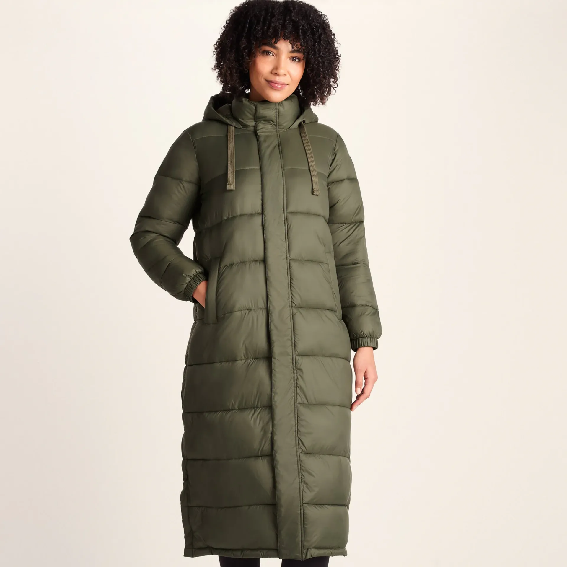 Product DescriptionThe Cautley women’s long padded jacket is the perfect companion for chilly and windy weather. Designed to keep you warm at your core while looking sleek and stylish, Cautley offers everything you’re looking for in a winter coat. The insulation is made with a high-performance filling made from recycled plastic bottles, making it a sustainable choice and a great alternative to down filling. Keeping comfort front of mind, this women’s padded jacket also features a full front zip that opens two ways for easy temperature control, along with chunky hood drawcords at the hood, a padded inner collar, and elastic cuffs to ensure you stay cosy no matter what. Added ventilation at the side seams also keep you comfortable when exploring outdoors. Perfect for Autumn wind and rain, ideal for Winter snow and cold.FeaturesWind resistant u0026amp; warmInsulated filling made from recycled plastic bottlesChunky quilted design2 Way zip opening fastened with velcro u0026amp; press studsChunky hood drawcords2 Lower zip pocketsPadded inner collarFitStudio model Mayara is wearing size 8 and is 5’11