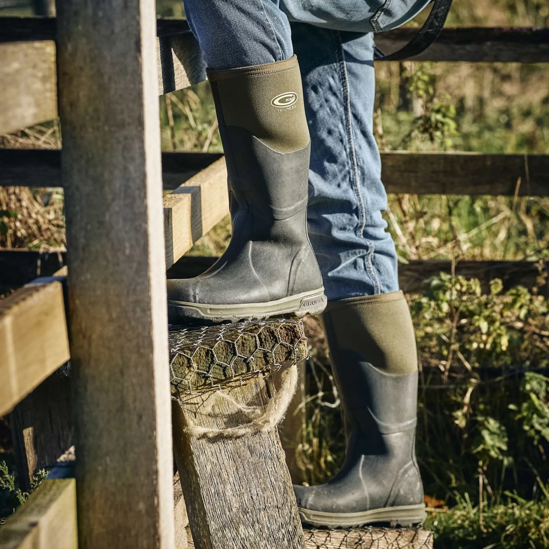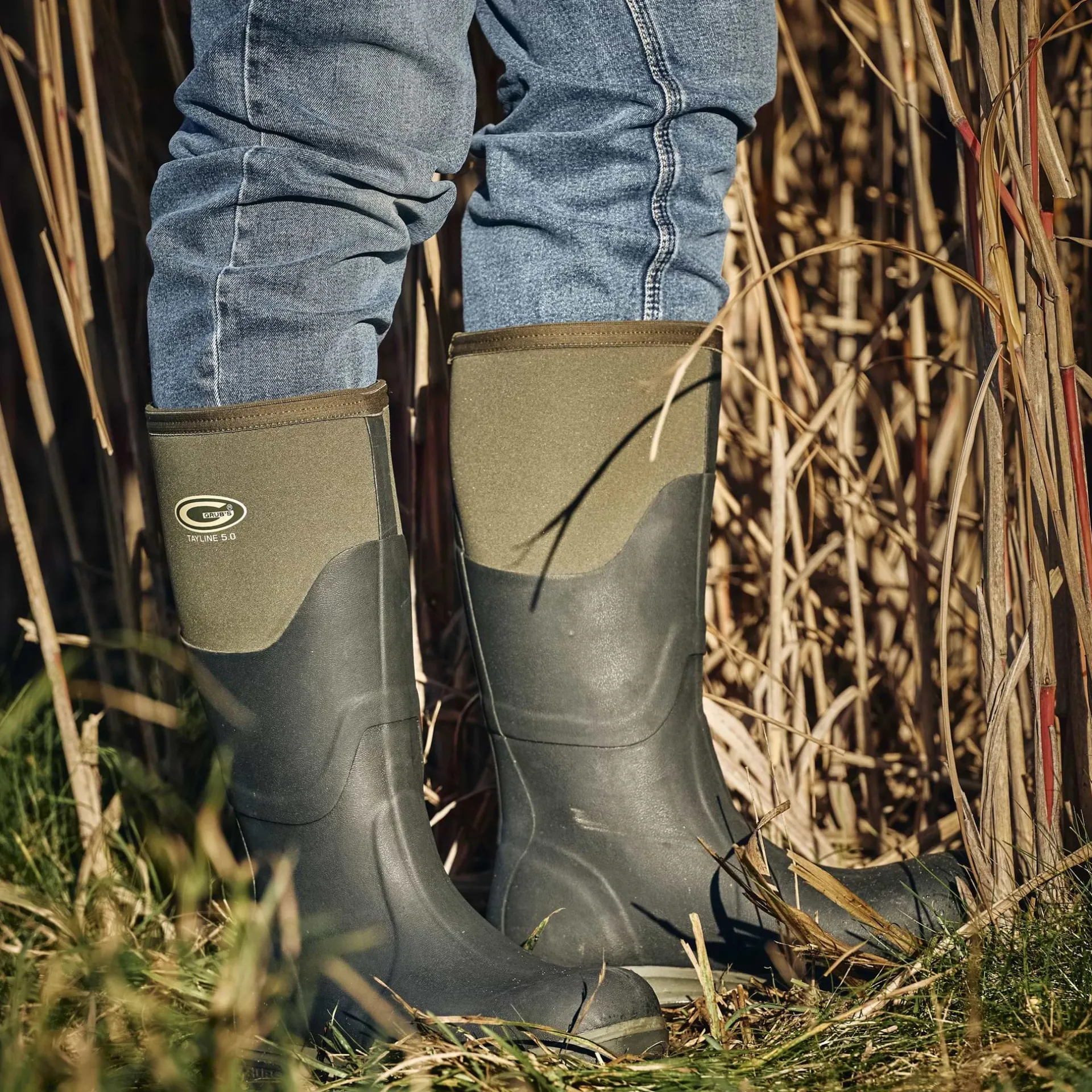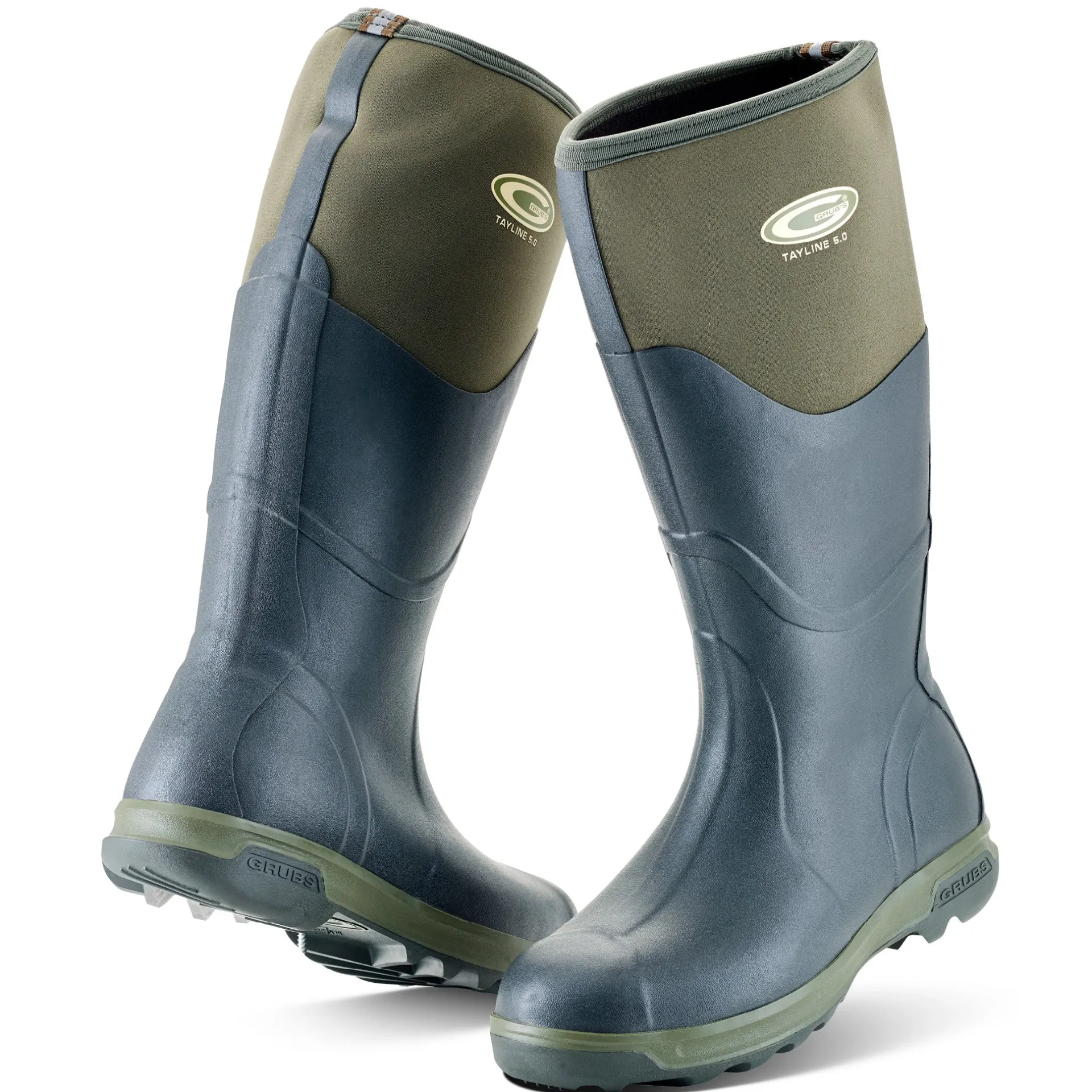 Product DescriptionTAYLINE 5.0⢠is designed for everyday use to ensure farmers have comfortable, dry, warm feet all day with superior grip.Features5MM INSUFOAM-ULTRA⢠NEOPRENE WITH CALF HEIGHT RUBBER – for comfort and warmth. TRAK⢠OUTSOLE – Deep tractor like tread gives powerful traction on soft ground with prominent heel for downhill braking. HEXZORB⢠technology – absorbs heel strike shock for daylong comfort. SUPERDRI⢠lining – is a hard wearing, wick moister away from the wearerâs foot to prevent a sweaty and uncomfortable feel. It is fungus and rot proof so will not smell like cotton-lined boots. Unique HARD TOE⢠TECHNOLOGY AND REINFORCED HEEL – reinforced toecap and ankle protects the wearerâs during daily activities. COMFORT RATING – -20Âşc to +20Âşc.FitMaterial CompositionUpper: 50% Rubber, 50% Nylon; Inner: 100% POLYESTER; Sole: 100% RubberCareBRUSH ME, WASH ME: Hose down your wellies after each use and once a month wash off excess dirt with just water and for a deep clean use water with a mild soap. Gently scrub with a soft bristle brush until your boot is clean, then leave the boots to dry naturally (not on a direct heat source).