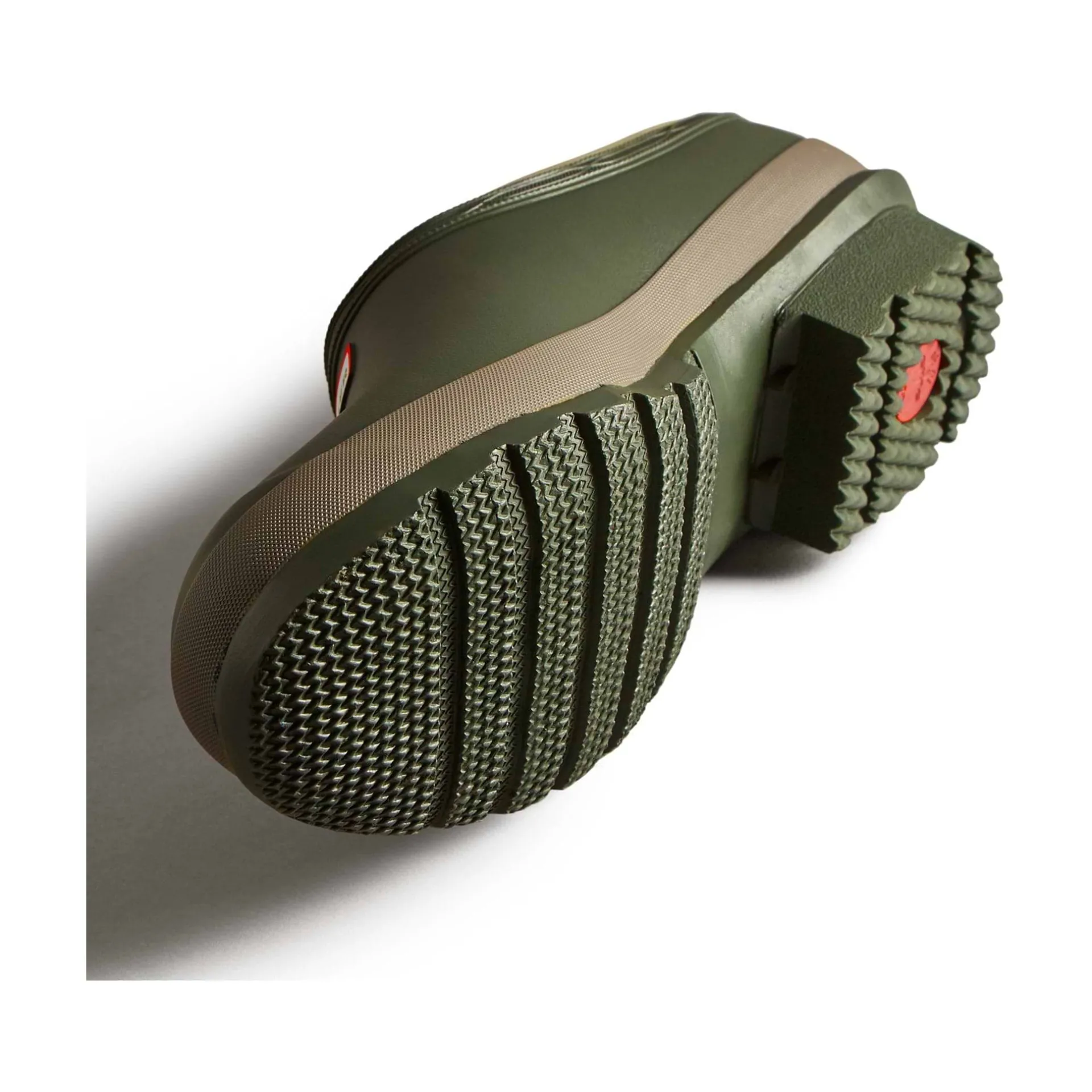 Product DescriptionA dark green slip-on shoe handcrafted from waterproof vegan rubber, designed for gardening. Updated with the iconic red box logo, the clog has a flexible natural rubber form and Hunter’s signature tread providing grip.FeaturesCertified veganWaterproofHandcraftedNatural rubber construction with matte finishNeoprene liningSignature calendered treadFitMaterial CompositionUpper: 100% Rubber. Lining: 100% Neoprene. Sole: 100% Rubber.Care