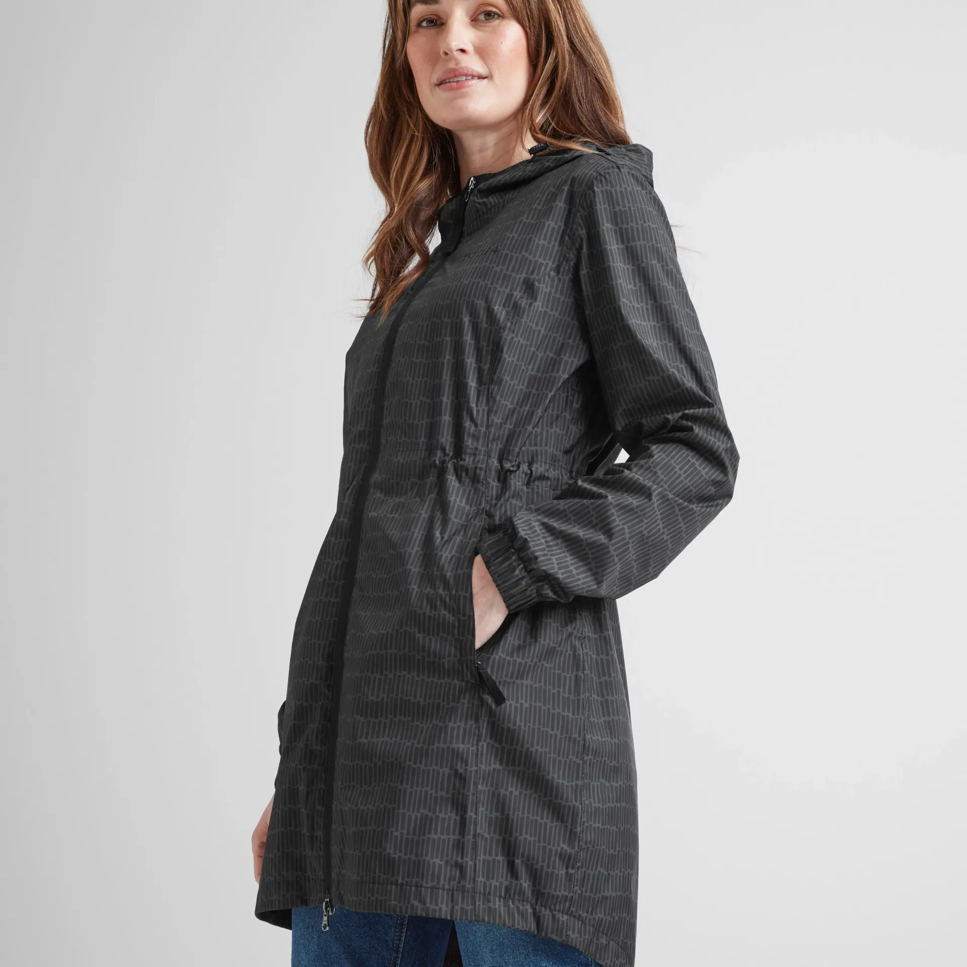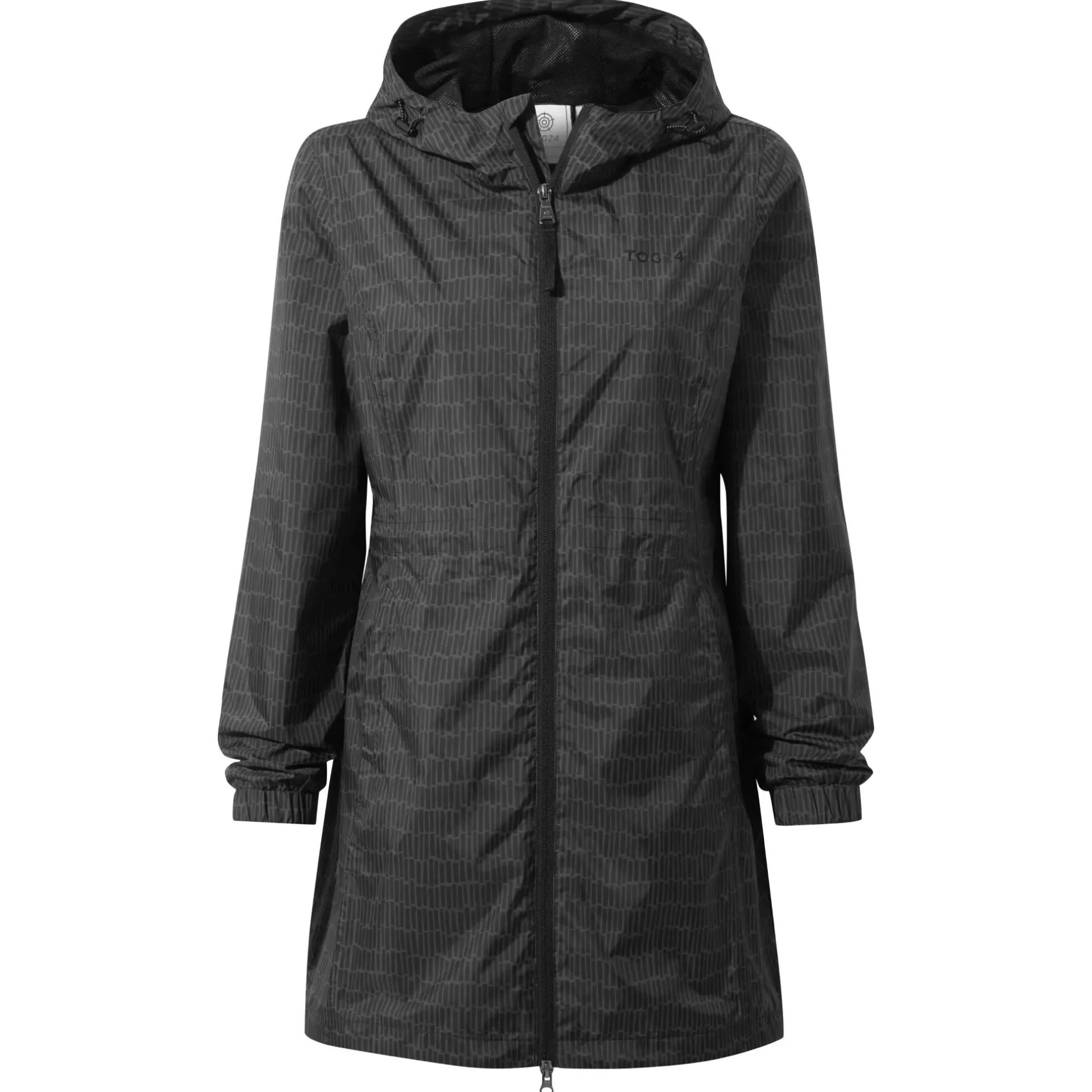 Product DescriptionKeep the Kilnsey packable rain jacket to hand and you won’t get caught out by seasonal showers – which we have our fair share of here in Yorkshire where our design team are based. This lightweight jacket is waterproof and breathable and the fully taped seams block out the rain to keep you completely dry. Kilnsey is cut in a longer length with a fishtail split at the bottom of the curved back and an adjustable elasticated waist for a feminine silhouette. It has a breathable mesh lining and sleeves with elasticated cuffs and easy glide taffeta lining, so it slips on and off with ease. Designed in fun patterns and colours inspired by trips to Whitby Bay, this rain jacket is finished with thoughtful design touches, such as pullers and trims dyed to match and a tonal TOG24 logo on the chest. You’ll also appreciate practical features such as the two-way front zip, a fixed, adjustable hood that you can shape round your face and two lower zip pockets.FeaturesWaterproof (5k), Breathable (5K)Fully taped seamsWindproofDWR water repellent coatingBreathable mesh liningSleeves with elasticated cuffs and easy glide taffeta liningFabric and mesh packaway bagTwo-way front zipFixed adjustable hoodElasticated waist with internal adjustment toggles2 lower zip pocketsPrinted TOG24 logo on the chestFitStudio model Emma Dress 8 UK, Height 5’9