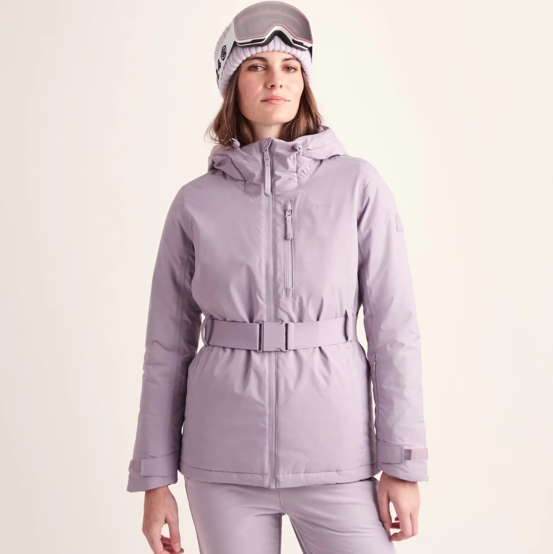 Product DescriptionReady to tackle those snow-covered mountains in style? The Meribel women’s ski jacket has you covered from first lift to last run. With impressive 20K waterproofing and 20K breathability, this women’s snow jacket keeps you dry and comfortable no matter the weather.nThe flattering hourglass design with a removable waist belt gives you two stunning looks in one – cinched for apres ski, or straight for performance. Inside the Meribel women’s snow jacket, the warm quilted lining and fully taped seams trap heat while keeping moisture out, and the DWR coating means snow and light rain simply roll off.nWhen the wind picks up, you’ll appreciate the fixed hood with its shaped peak and handy toggle adjusters that keep your vision clear for those perfect turns. The waterproof zip with glove-friendly puller means no more fumbling at the chairlift, while chunky easy-grab cuff adjusters let you seal the snow outside of this coat in seconds.nThe Meribel women’s ski coat has no shortage of storage, wiFeaturesWaterproof (20K), Breathable (20K), and WindproofWarm quilted liningFully taped seamsWater repellent coating (DWR)Removable u0026amp; adjustable waist beltFixed hood with shaped and fused hood peakFull length wp zip with glove-friendly pullerToggle adjusters to hood and hem1 chest zip pockets, 2 Lower zip pockets, 1 sleeve zip pocket for ski passChunky easy grab cuff adjustersSki features include; snow cuffs, 1 inner mesh goggle pocket, ski goggle wipe, glove ringSnowskirt has a gel print on the edge for grip and a DWR finish – this is not removeable.TOG24 badge on sleeve u0026amp; raised logo print on chestFitStudio model Gina Dress 8/10 uk Height 5’11* Bust 34c Waist 26.5