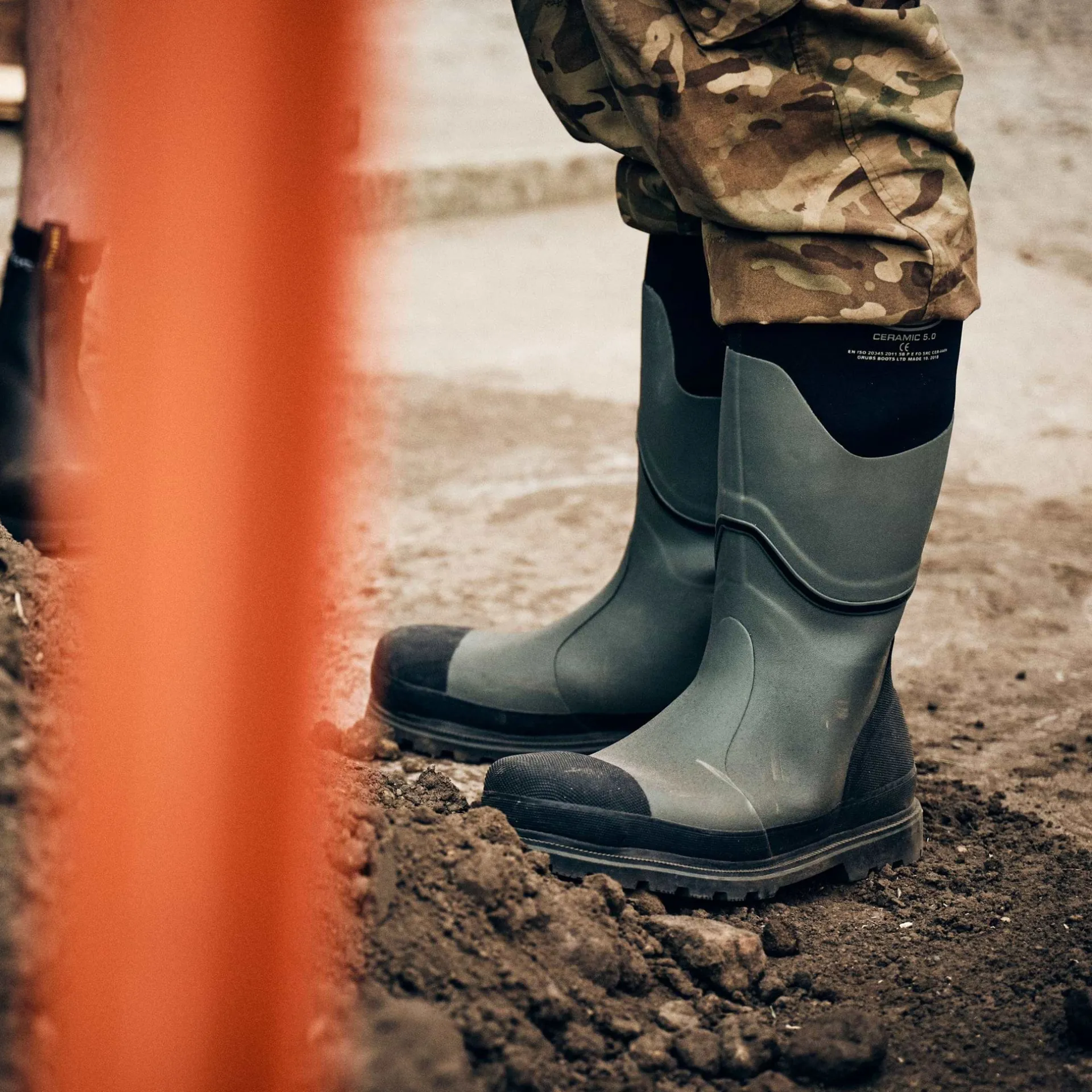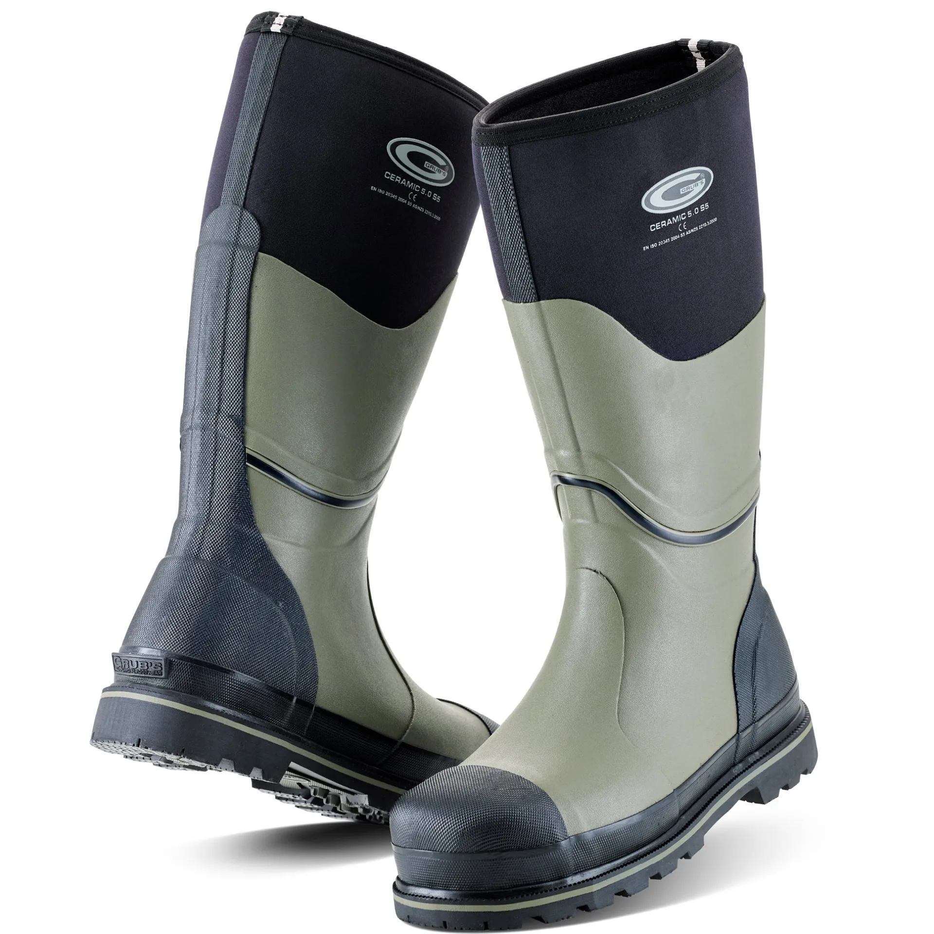 Product DescriptionGrubs CERAMIC 5.0 S5⢠is the world’s first rubber safety boot that uses non-metallic materials. This means it conducts neither cold nor electricity making them popular in a wider field of safety footwear. FeaturesCERAMIC SAFETY TOE – complies with BS EN ISO 203450 S5 without cold absorbing/ emitting metal materials. DEFENDERâ˘, 5mm Ballistic insole – lightweight and flexible whilst passing both BS EN ISO 20344: 2004 5.8.2 penetration standard and BS EN ISO 20344: 2004 5.9 flex resistance, without the cold of Steel. 5MM INSUFOAM-ULTRA⢠NEOPRENE WITH CALF HEIGHT RUBBER – all round foot comfort and warmth. 4mm rubber over the whole foot area makes it highly resistant to puncture and flex cracking. 6mm NITROCELL⢠footbed – provides a soft cushioning for an athletic shoe feel. A million microscopic nitrogen bubbles that insulate the wearer from cold surfaces. TREDZâ˘(DURAPRENEâ˘rubber) outsole – superior grip on a variety of surfaces, the tread is designed to work with the action of the foot, is oil resistant and passes TM144: 1999slip resistance test. COMFORT RATING – -20Âşc to +20ÂşcFitMaterial CompositionUpper: 70% Rubber 30% Nylon; Inner: 100% POLYESTER; Sole: 100% RubberCareBRUSH ME, WASH ME: Hose down your wellies after each use and once a month wash off excess dirt with just water and for a deep clean use water with a mild soap. Gently scrub with a soft bristle brush until your boot is clean, then leave the boots to dry naturally (not on a direct heat source).