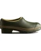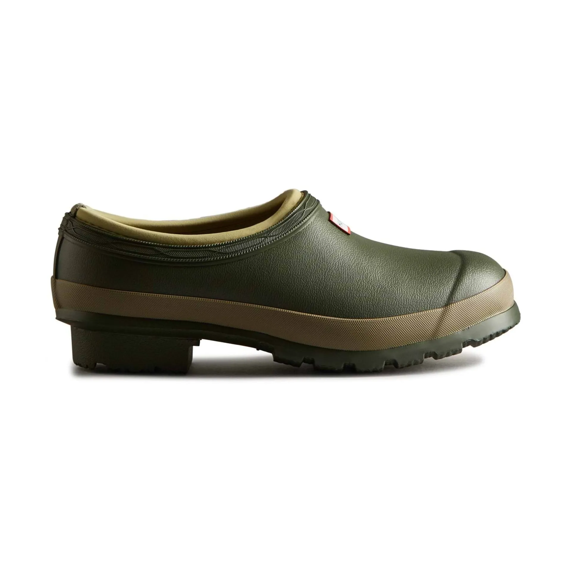 Product DescriptionA dark green slip-on shoe handcrafted from waterproof vegan rubber, designed for gardening. Updated with the iconic red box logo, the clog has a flexible natural rubber form and Hunter’s signature tread providing grip.FeaturesCertified veganWaterproofHandcraftedNatural rubber construction with matte finishNeoprene liningSignature calendered treadFitMaterial CompositionUpper: 100% Rubber. Lining: 100% Polyester. Sole: 100% RubberCare