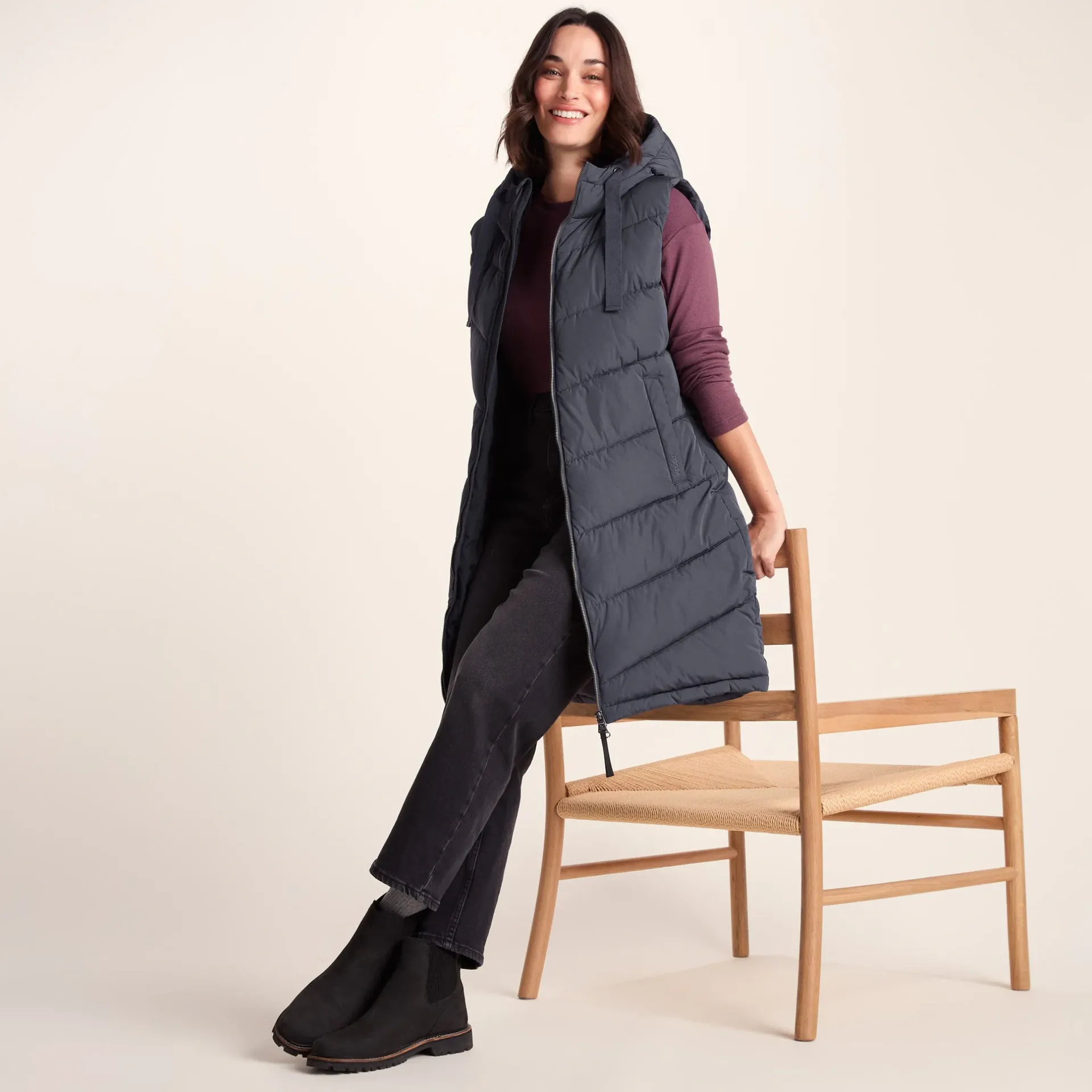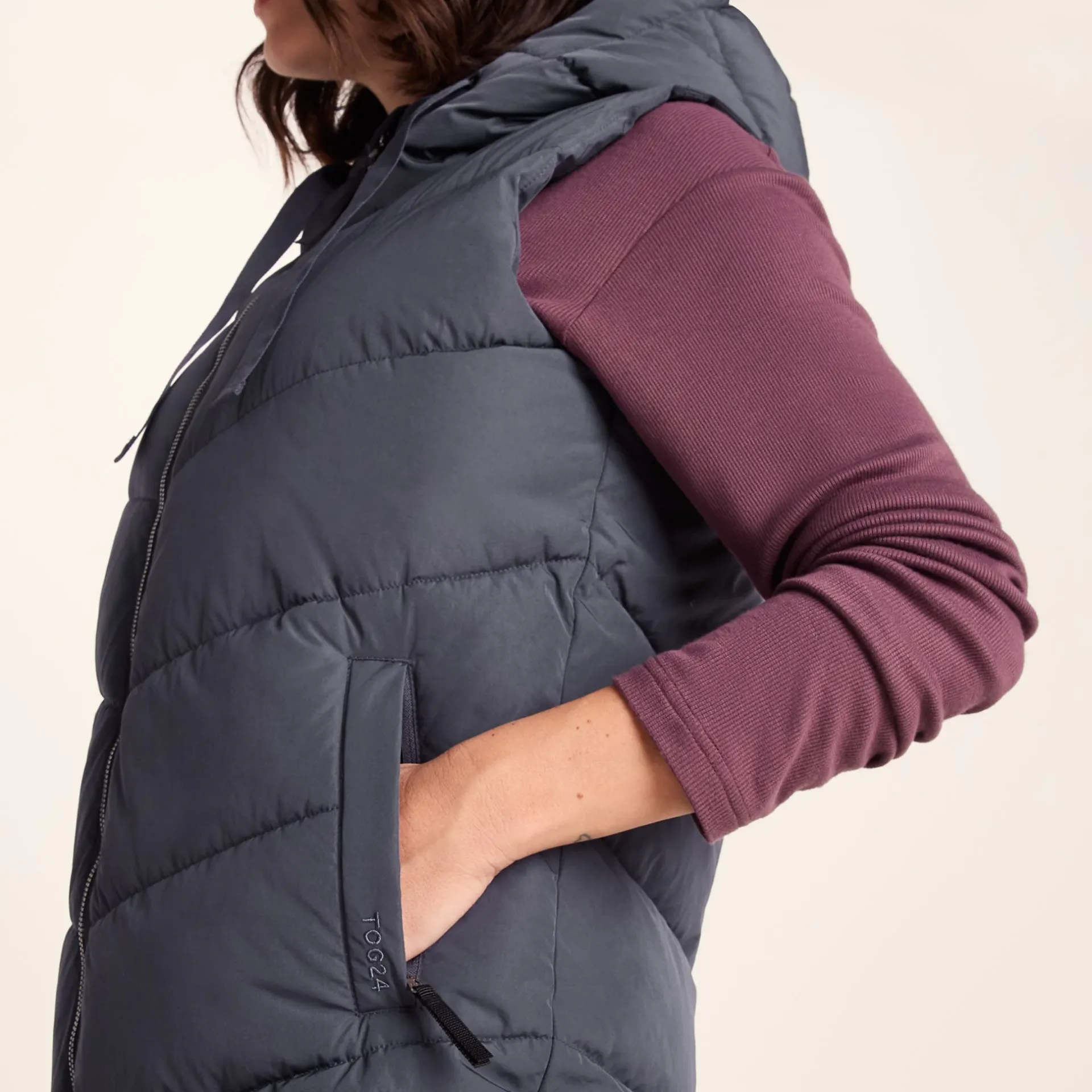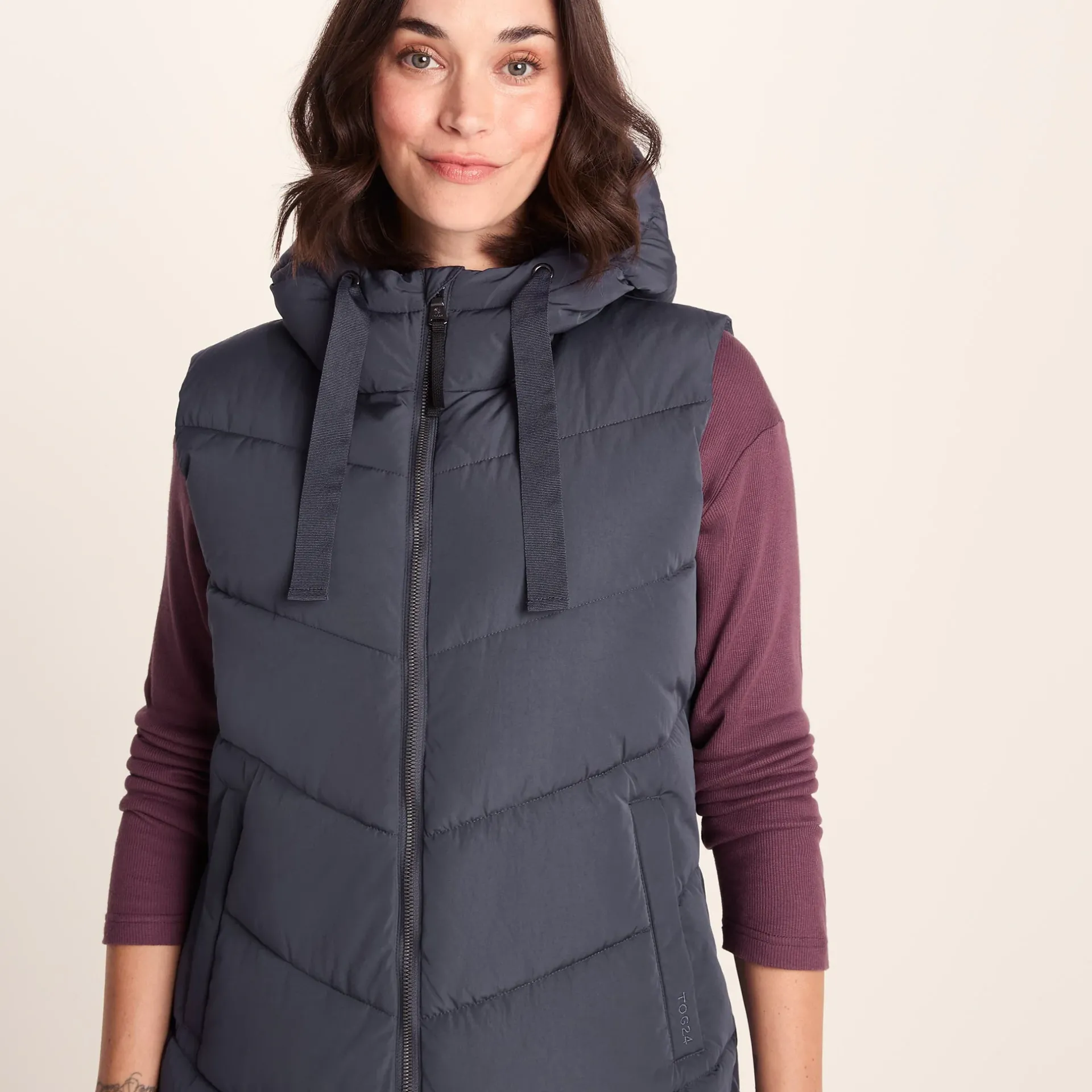 Product DescriptionWhen itâs cold and windy, but you need your arms free for a full range of movement, our Ranskill extra long padded gilet is just the job. Ranskill is quilted in a chunky, but flattering, chevron design and thickly padded with a warm, insulated eco filling. The soft and cosy fixed hood can be adjusted with dyed to match chunky drawcords for a custom fit. Designed by our team in West Yorkshire to be robust enough to stand up to everyday wear, Ranskill has a full length two-way zip secured with press studs, making it easy to slip on and off, and two cosy lower zip up pockets with chunky pullers that can double up as hand warmers if you forget your gloves. Ranskill comes in colours inspired by the natural beauty of Yorkshire and the finishing touch is our signature TOG24 embroidered logo on the pocket.FeaturesWind resistant u0026amp; warmInsulated filling made from recycled plastic bottlesChevron quilted designChunky hood drawcords2 Way zip opening on front of gilet fastened with press studs2 Lower zip pocketsLogo embroidery on pocketFitStudio model Georgia Dress 8 uk Height 5’10* Bust 34 Waist 25.5