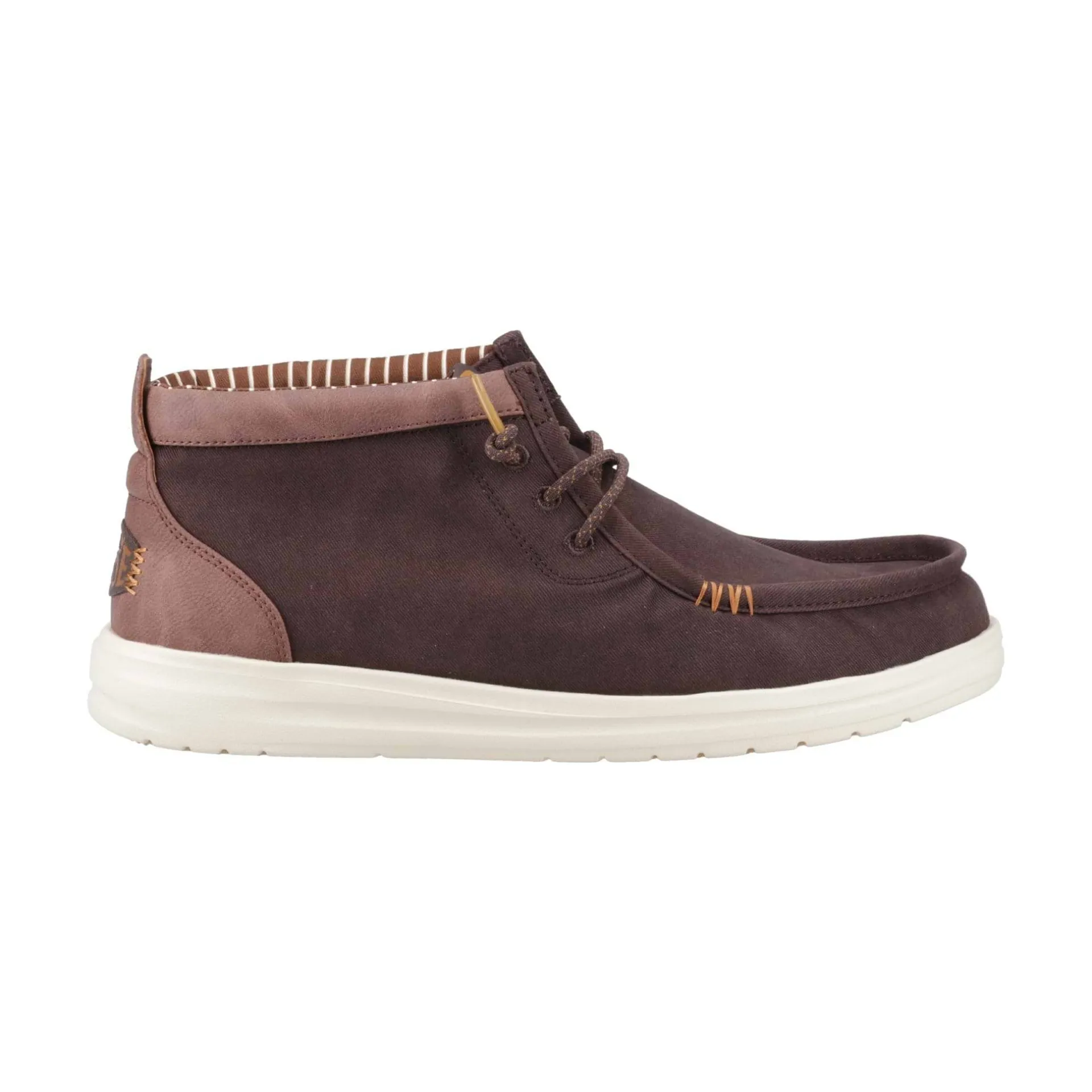 Product DescriptionEasy to step your foot into and snug without having to tie the laces, these Wally Mid shoes have rewritten the book on casual simplicity. The upper is made from heavyweight twill with a synthetic PU heel cap for some added structure.FeaturesHeavy weight twill – Textile upperElastic lacesPU synthetic heelstriped print lining. PU heel and collarEasy-on systemTravel readyRemovable foam insoleLightweight outsoleFitMaterial CompositionUpper: Cotton. Lining: Cotton. Sole: EVA.Care