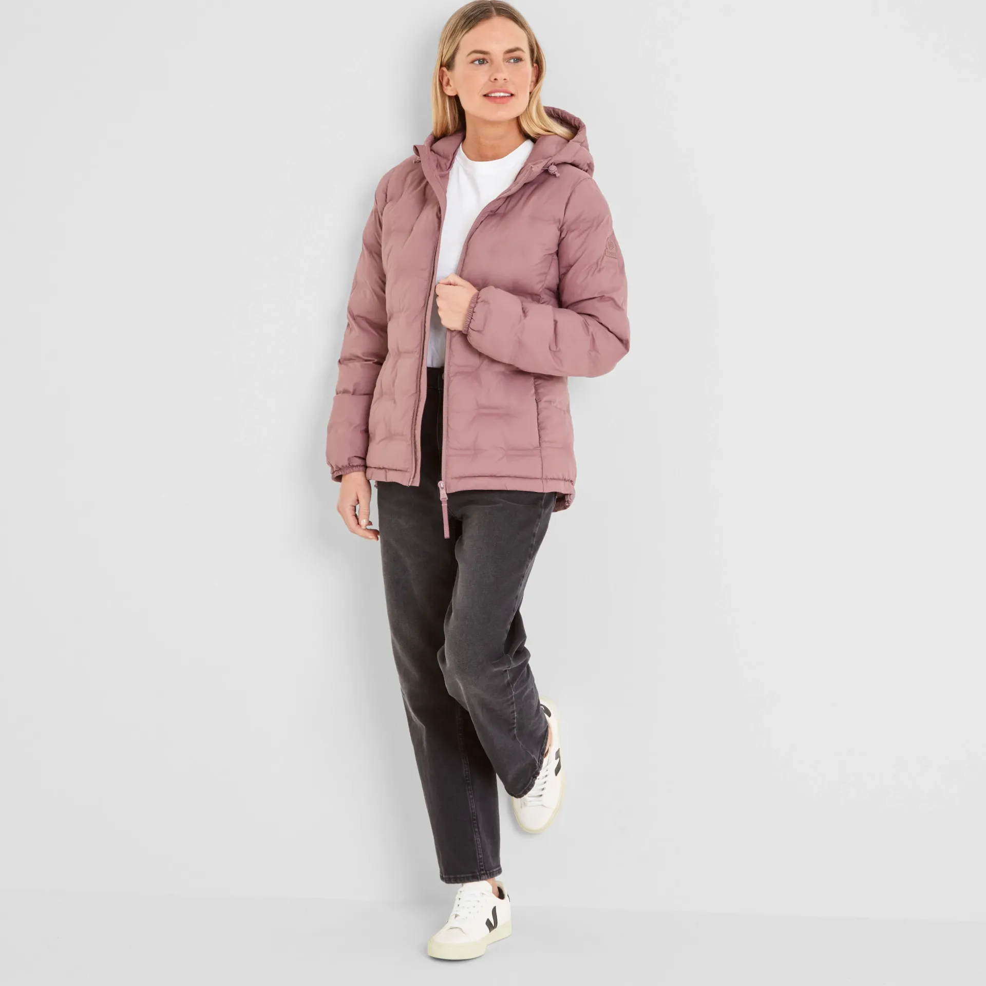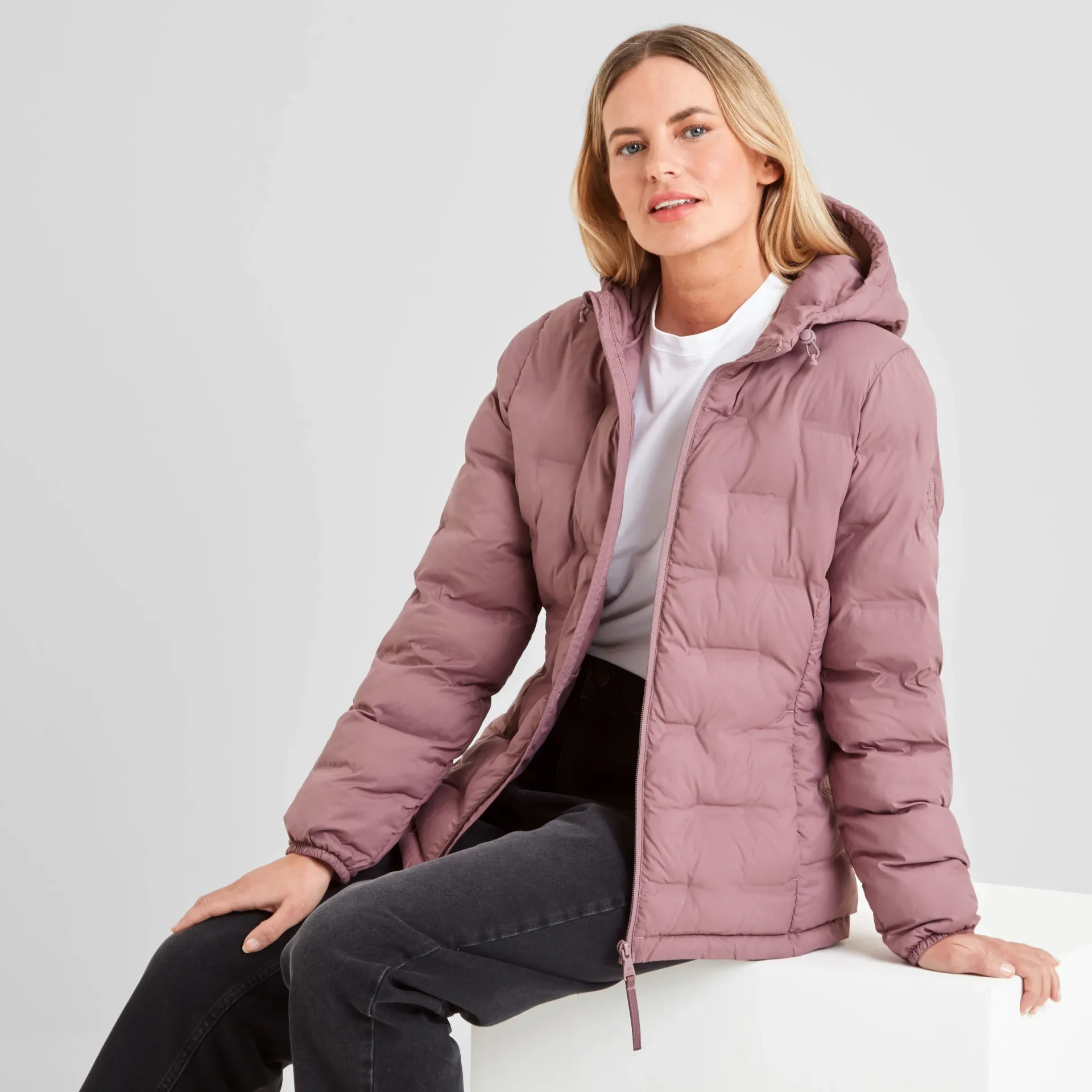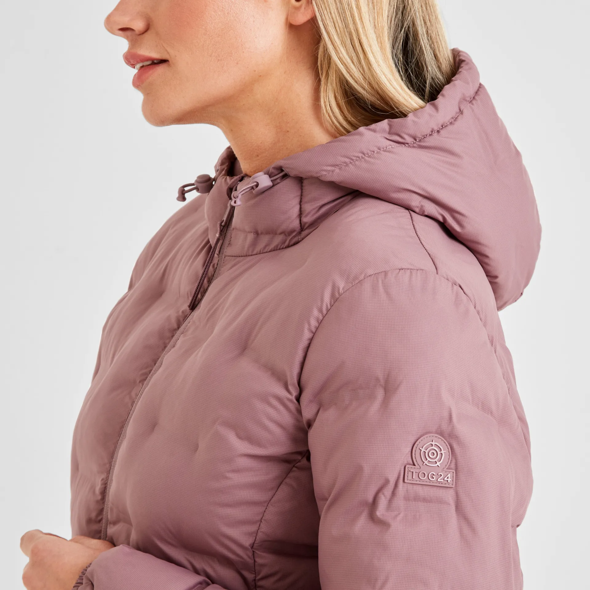 Product DescriptionThe Palmer womenâs padded jacket is all about warmth and style. With sleek heat-sealed baffles designed to lock in warmth, it features a modern, stepped pattern that keeps you looking great and feeling cosy on those chilly days. The insulation, made from recycled plastic bottles, and a durable water-repellent finish makes light rain roll right off, so drizzles wonât slow you down. Perfect for tackling brisk winds or layering up on damp days, the Palmer has rubberised toggle adjusters at the hood and hem, letting you get the perfect fit and keep out the chill. Itâs practical, too, with a full zip front and two lower zip pockets to safely stash your essentials. Built to handle everything from morning errands to weekend adventures, this wind-resistant jacket is finished with TOG24 badge.FeaturesLIGHT RAIN PROTECTION, WIND RESISTANT AND WARMWATER REPELLENT COATING (DWR)HEAT SEALED BAFFLESZIP OPENING ON FRONTTOGGLE ADJUSTERS ON THE HOOD OPENINGTOGGLE ADJUSTERS ON THE HEM2 LOWER ZIP POCKETSTOG24 BADGE ON SLEEVEFitStudio model Izzy Dress 8 UK, Height 5’7