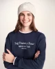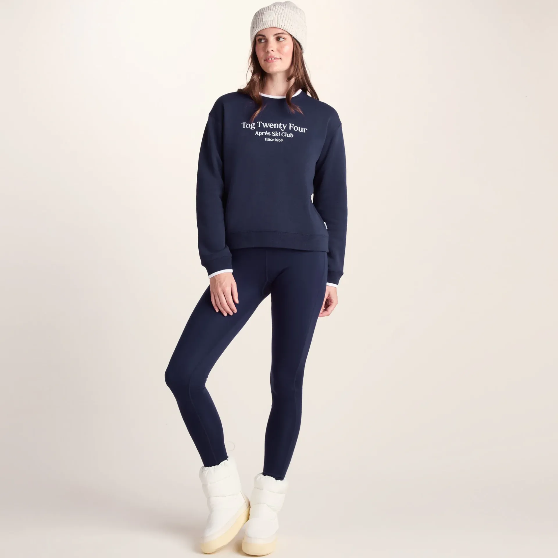 Product DescriptionLooking for that cosy combo of warmth and après ski chic? The Peggy sweatshirt has you covered. This supremely soft crew neck sweater is your new best friend, whether you’ve been out braving the cold or you’re just settling in for a lazy weekend.nThe magic happens the moment you slip it on – that brushed-back inner feels absolutely heavenly against your skin, wrapping you in warmth that you’ll never want to take off. This sweatshirt is cut in a fashionable boxy fit with dropped shoulders that give you a cool, relaxed vibe while flattering your figure.nThe contrast tipping on the neck and cuffs adds a sporty little twist, with just the right pop of white to lift the look. The après ski embroidery on the chest announces your mountain-ready style, whether you’ve actually hit the slopes or just want to look like you have!nnFinished off with comfy ribbed cuffs that help it keep its shape, the Peggy sweatshirt is easy to throw on with jeans, leggings, or even over a casual dress. Cosy, flatFeaturesSupersoft brushed back crew neck sweatContrast tipping to neck and cuffsApres Ski embroidery to chestDropped shoulderRib neck, cuffs u0026amp; hemTOG24 label in the side seamFitStudio model Gina Dress 8/10 uk Height 5’11* Bust 34c Waist 26.5