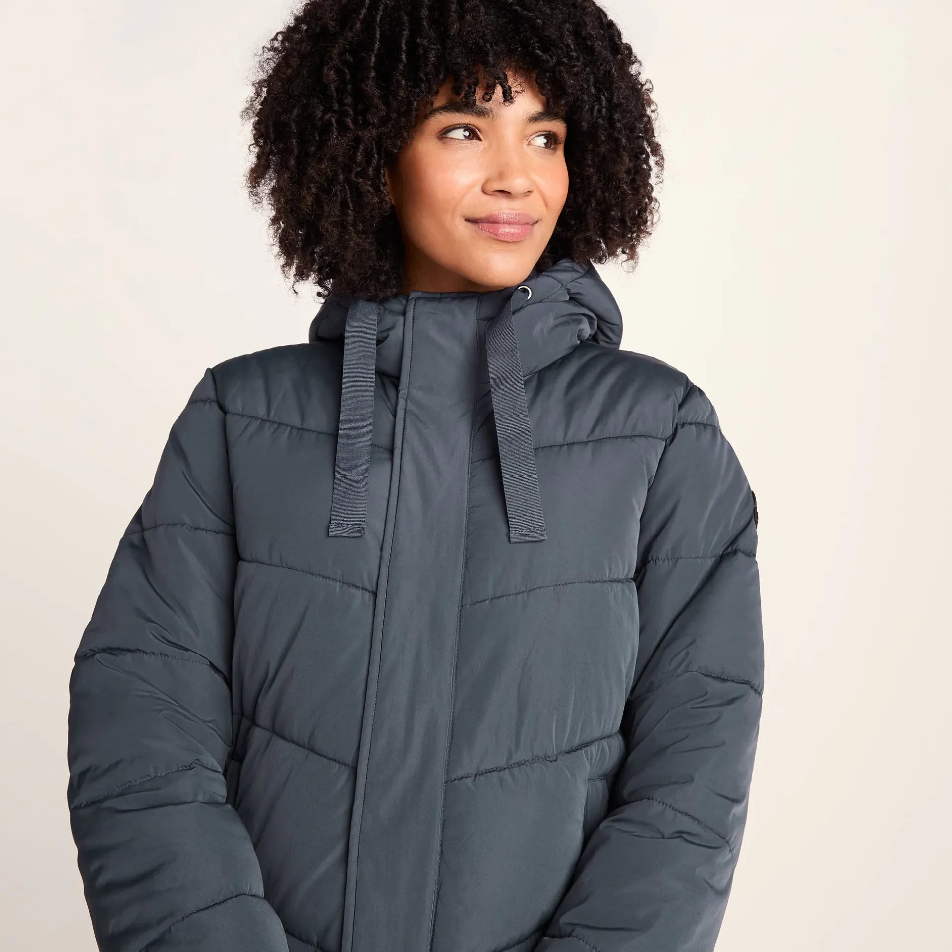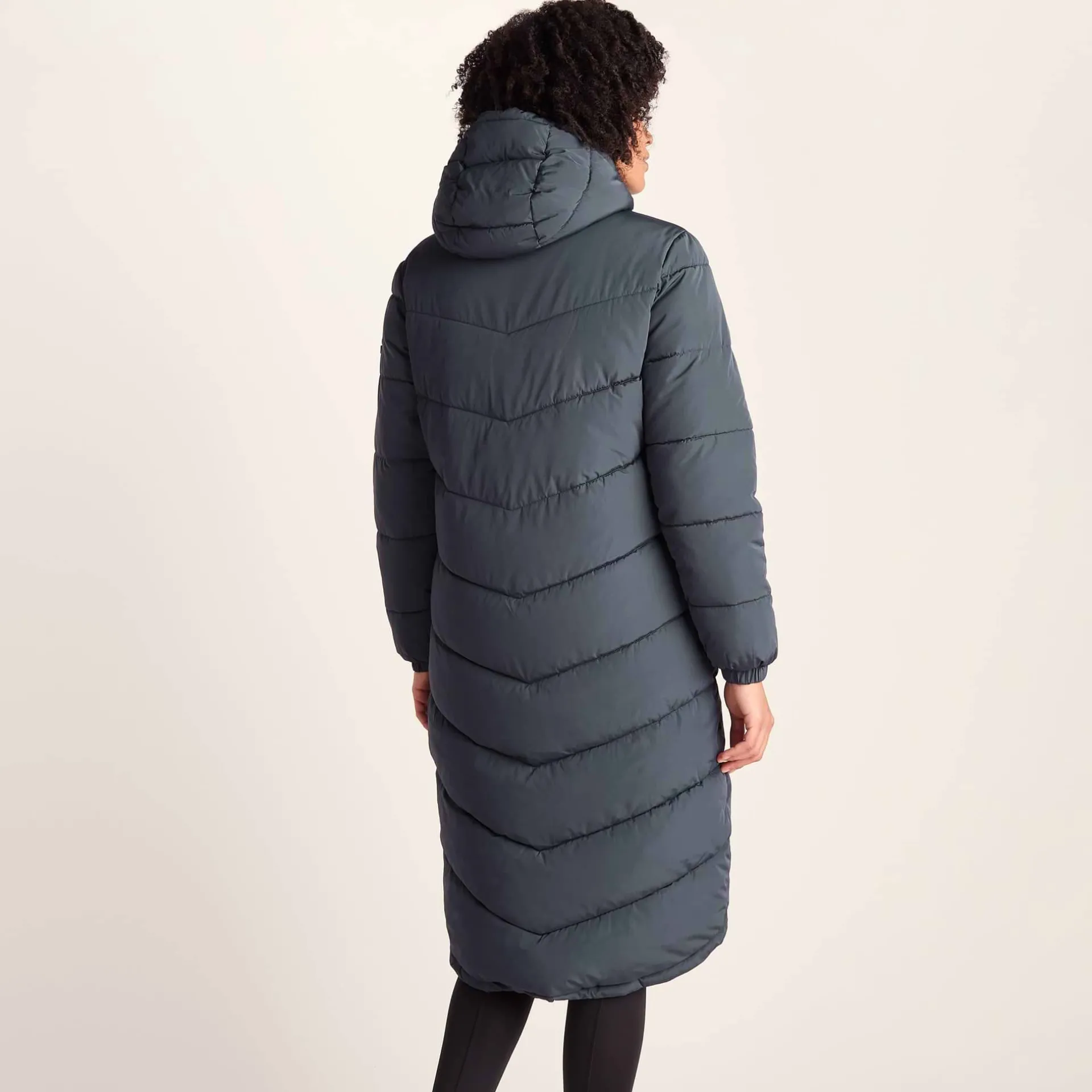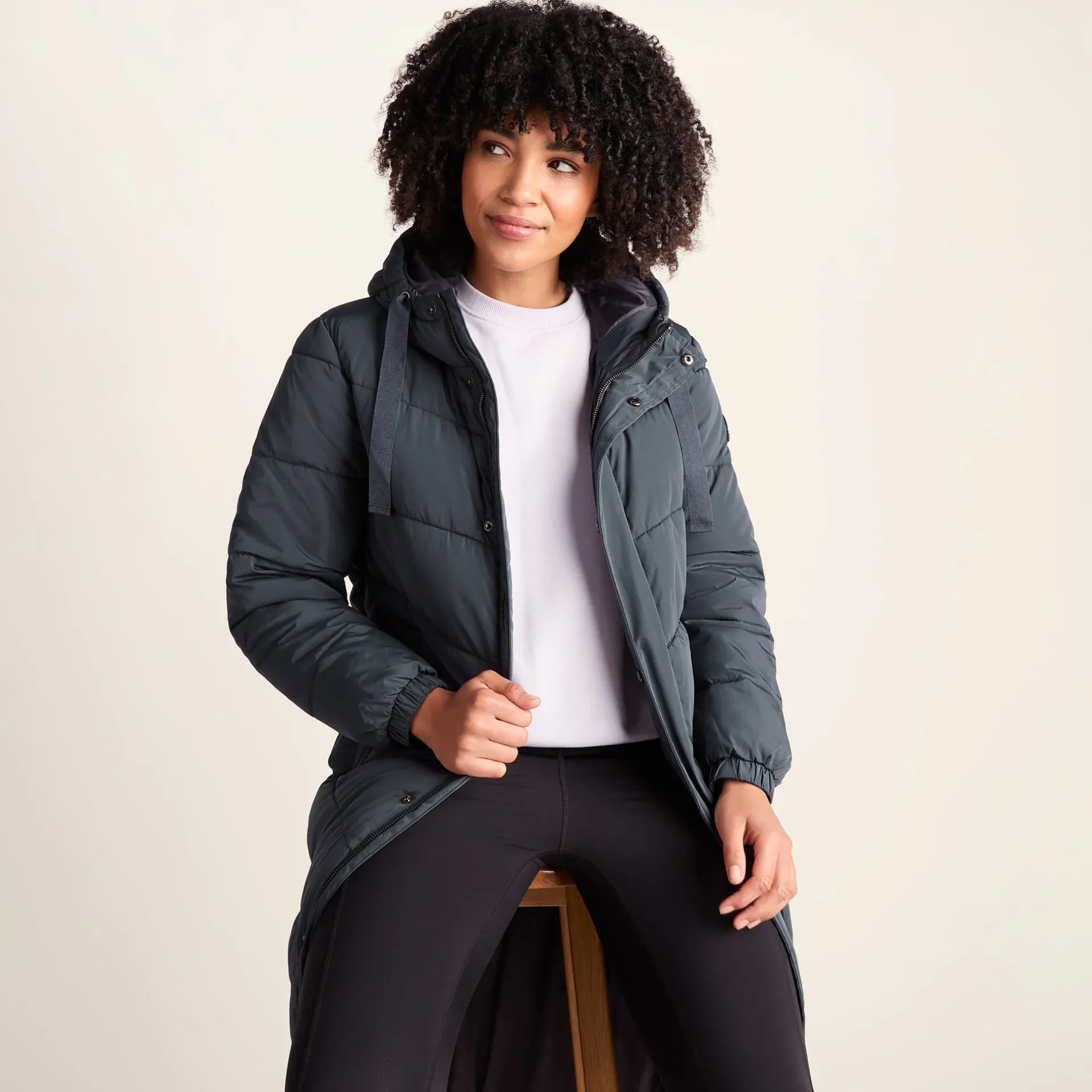 Product DescriptionWhen it’s cold and windy, as it often is in Yorkshire, you’ll stay warm and cosy wearing out Raleigh padded puffer coat with wide, chevron panels that is super warm, wind resistant and comes with a high performance thermal filling made from recycled plastic bottles. Going out in Raleigh is like wearing a sleeping bag as it’s extra long, has a fixed hood with chunky drawcords and elasticated cuffs to keep the wind out. It still allows for a full range of movement and is easy to get on and off thanks to the full length, two-way zip that is concealed behind a panel that fastens with press studs. This super warm coat also has two lower zip up pockets that double up as hand warmers if you forget your gloves. The finishing touch is embossed rubber Yorkshire Rose badge on the sleeve.FeaturesWarm and wind resistantThermal filling made from recycled plastic bottlesChevron quilted panelsFull length two way concealed zip with press studs2 lower zip up pocketsFixed hood with chunky drawcordsElasticated cuffsEmbossed rubber Yorkshire Rose badge on the sleeveFitStudio model Isabelle is wearing size 8 and is 5’7