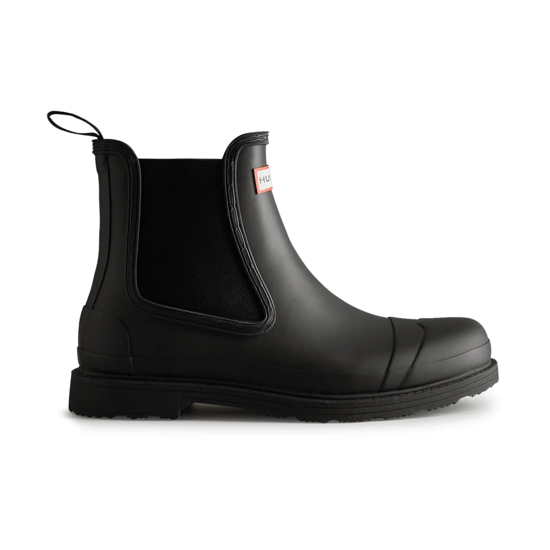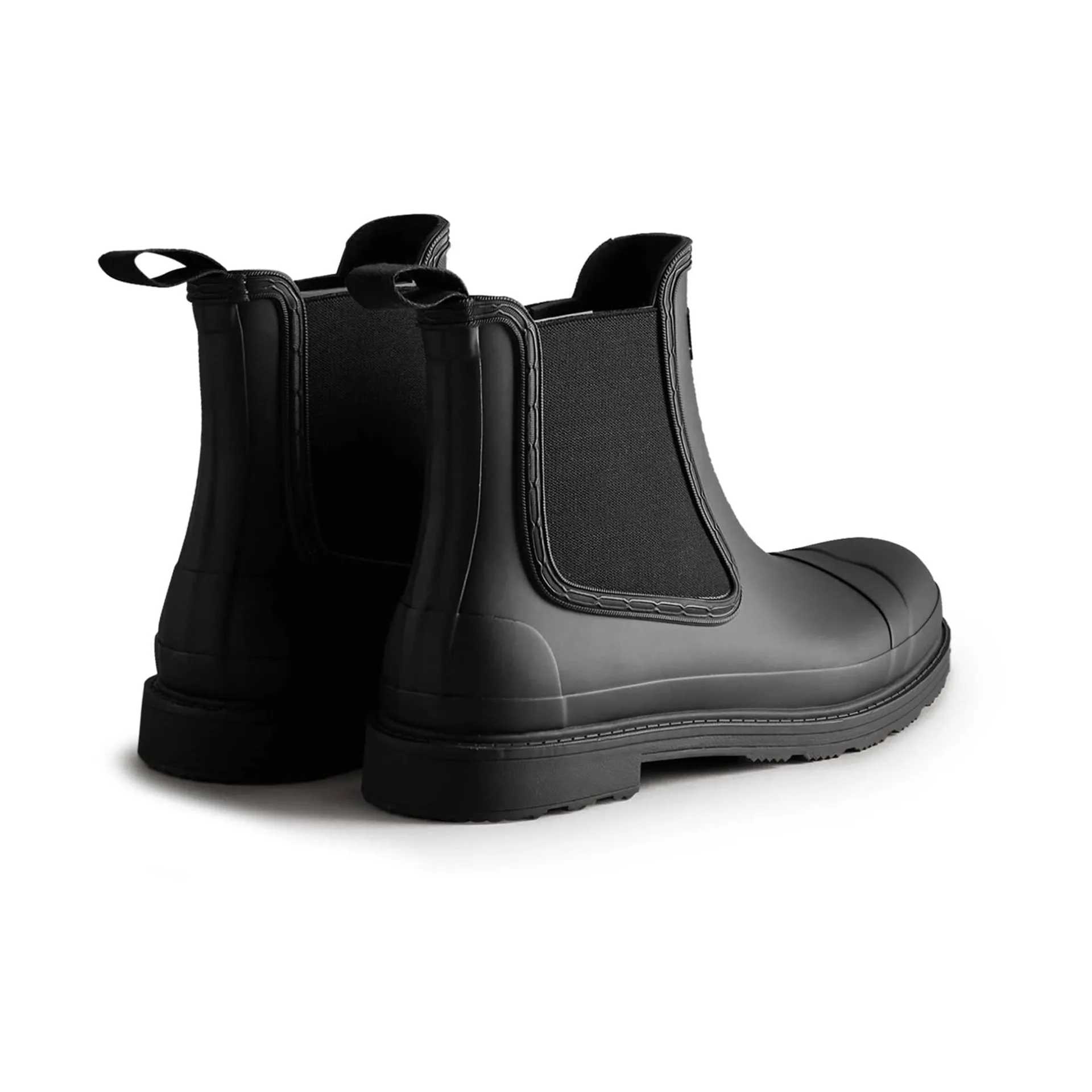 Product DescriptionCrafted from natural FSC-certified, vegan rubber, the 100% waterproof Commando Chelsea Boot is a new addition to our iconic Original collection. This new silhouette has a higher profile, reaching 15mm further up the leg.FeaturesCertified veganWaterproofHandcraftedRecycled polyester lining and insoleRubber moulded outsole with Hunter Original tread patternElastic side gussets and nylon pull-tab for ease of foot entryCrafted from natural vulcanised rubber from an FSC-certified plantationFitMaterial CompositionUpper: 12% Elastic 88% Rubber. Lining: 100% Recycled Polyester. Sole: 100% RubberCare