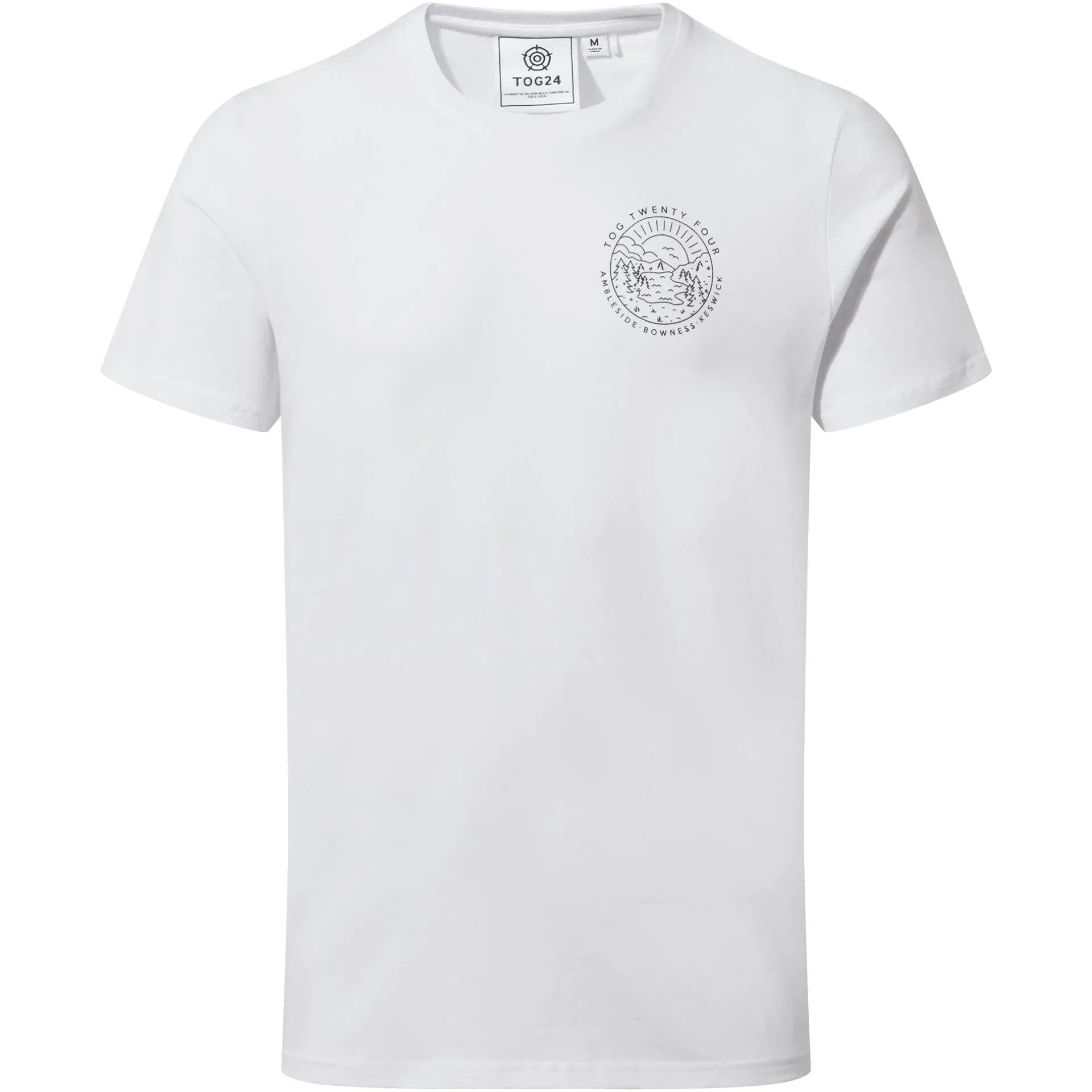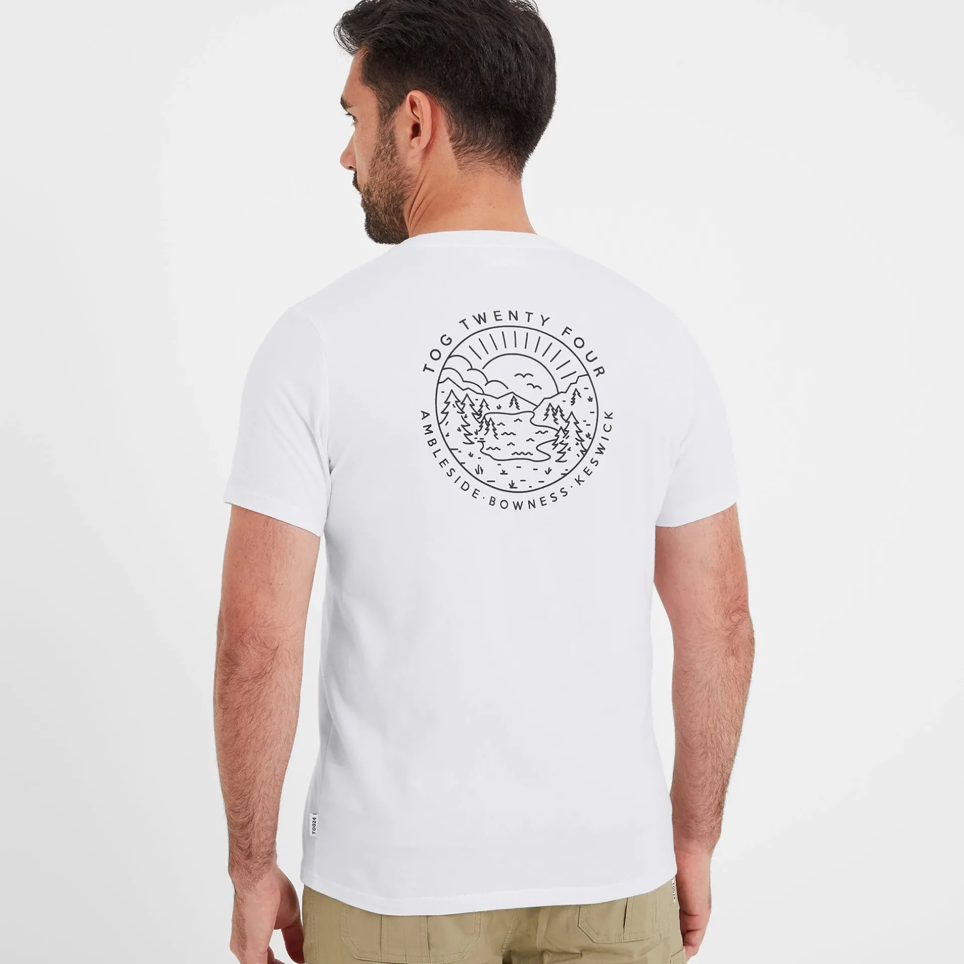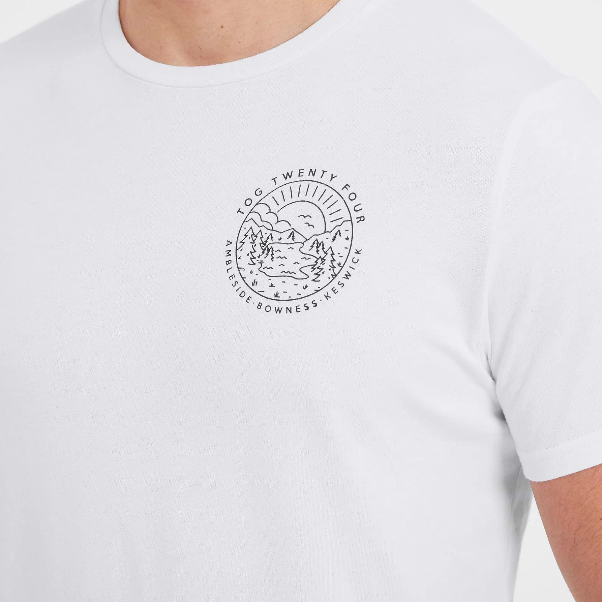 Product DescriptionCelebrating the stunning lakeside towns of Ambleside, Bowness and Keswick, our Lakes men’s crew neck t-shirt proudly displays a small graphic on the chest, with a larger version on the back. These depict the glorious Lake District landscape edged with the name of the towns and TOG Twenty Four printed in jewel colours. This cool and comfortable t-shirt comes in supersoft 100% sustainable cotton that feels great against your skin and it has a comfy ribbed crew neck too.nnLakes makes the perfect gift for friends and family as a reminder of happy hikes enjoying the stunning Lake District scenery. This graphic tee was designed by our team based in the beautiful Spen Valley in West Yorkshire and the finishing touch is a small woven TOG24 label on the side seam.FeaturesSupersoft 100% sustainable cotton short sleeve teeRib crew neckSmall graphic print on chestLarge graphic print on backWoven label on side seamFitStudio model Daniel is wearing size M and is 6’0