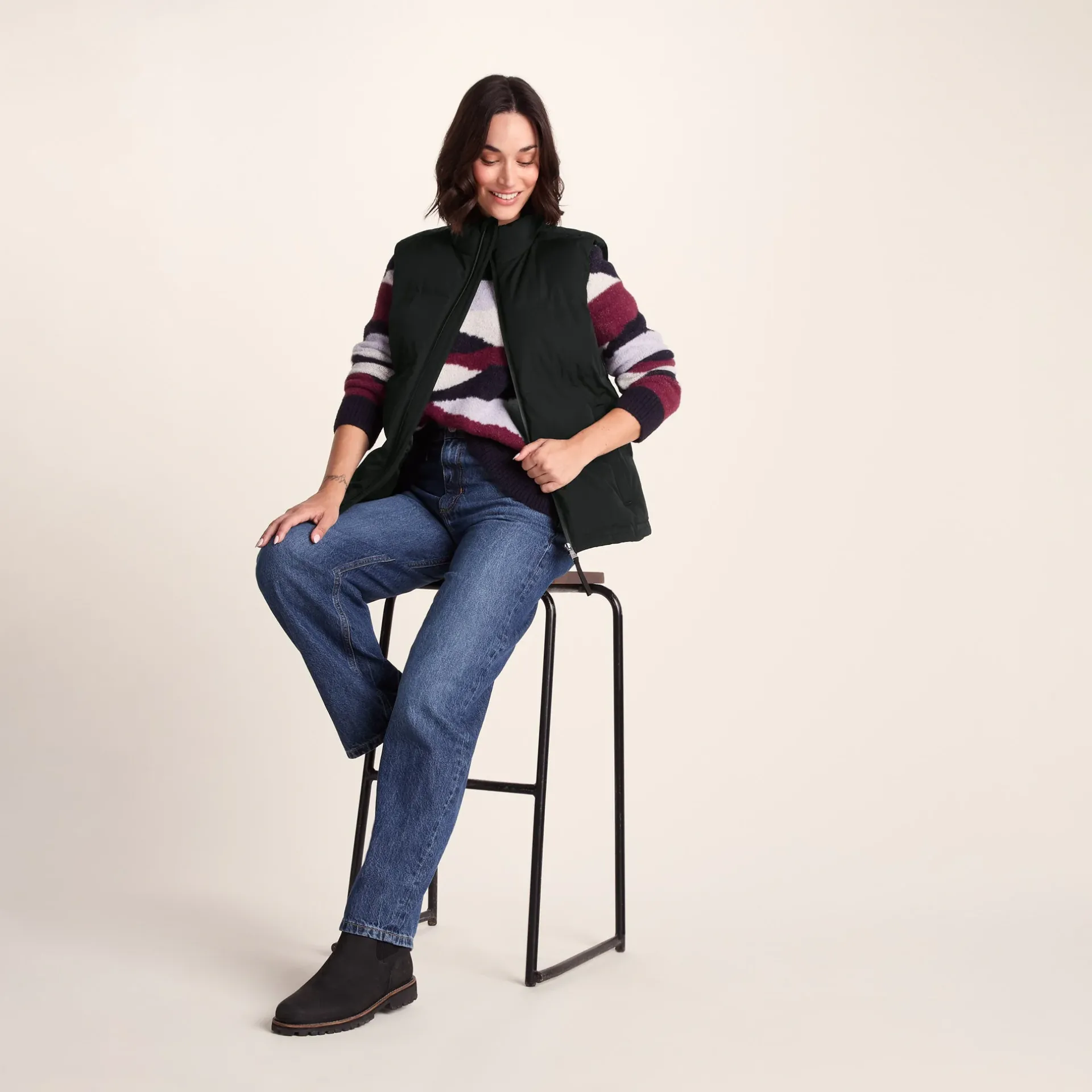 Product DescriptionLooking for a layer that keeps you warm without restricting your movement? Say hello to the Elyna women’s Gilet – the perfect companion for those days when the weather can’t make up its mind.nWith a trendy heat-sealed quilted design, this women’s gilet is built to keep you cosy. Its laid-back, boxy fit is perfect for throwing over your favourite jumper or long-sleeve tee and pairs well with jeans, leggings or trousers.nIf the wind starts to pick up, the deep quilted funnel collar on this women’s vest has you covered (quite literally), providing that extra bit of warmth and protection to your neck. Plus, let’s not forget the adjustable toggle at the hem that lets you change the fit to lock in warmth and the light DWR coating, which will come in handy if it starts drizzling.nBut it’s not just about looking good – this women’s gilet is packed with practical features, too, including a waterproof front zip, two zip pockets to stash your belongings, and a handy inner zip pocket that’s perfeFeaturesLight rain protection, wind resistant and warmHeat sealed quilted designWater repellent coating (DWR)Relaxed boxy fitDeep funnel collarWP zip opening to front2 lower zip pockets, 1 inner zip pocketToggle adjusters to hemTOG24 embroidery on pocketFitStudio model Georgia Dress 8 uk Height 5’10* Bust 34 Waist 25.5