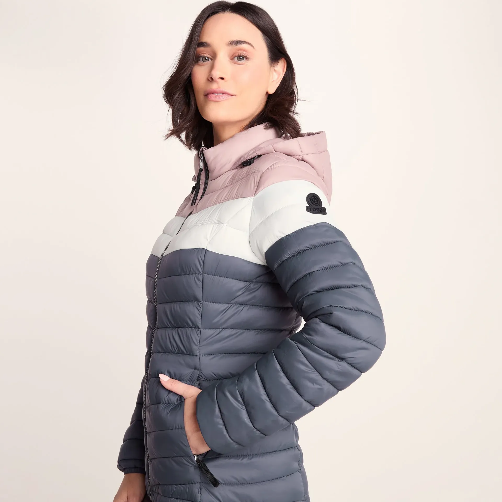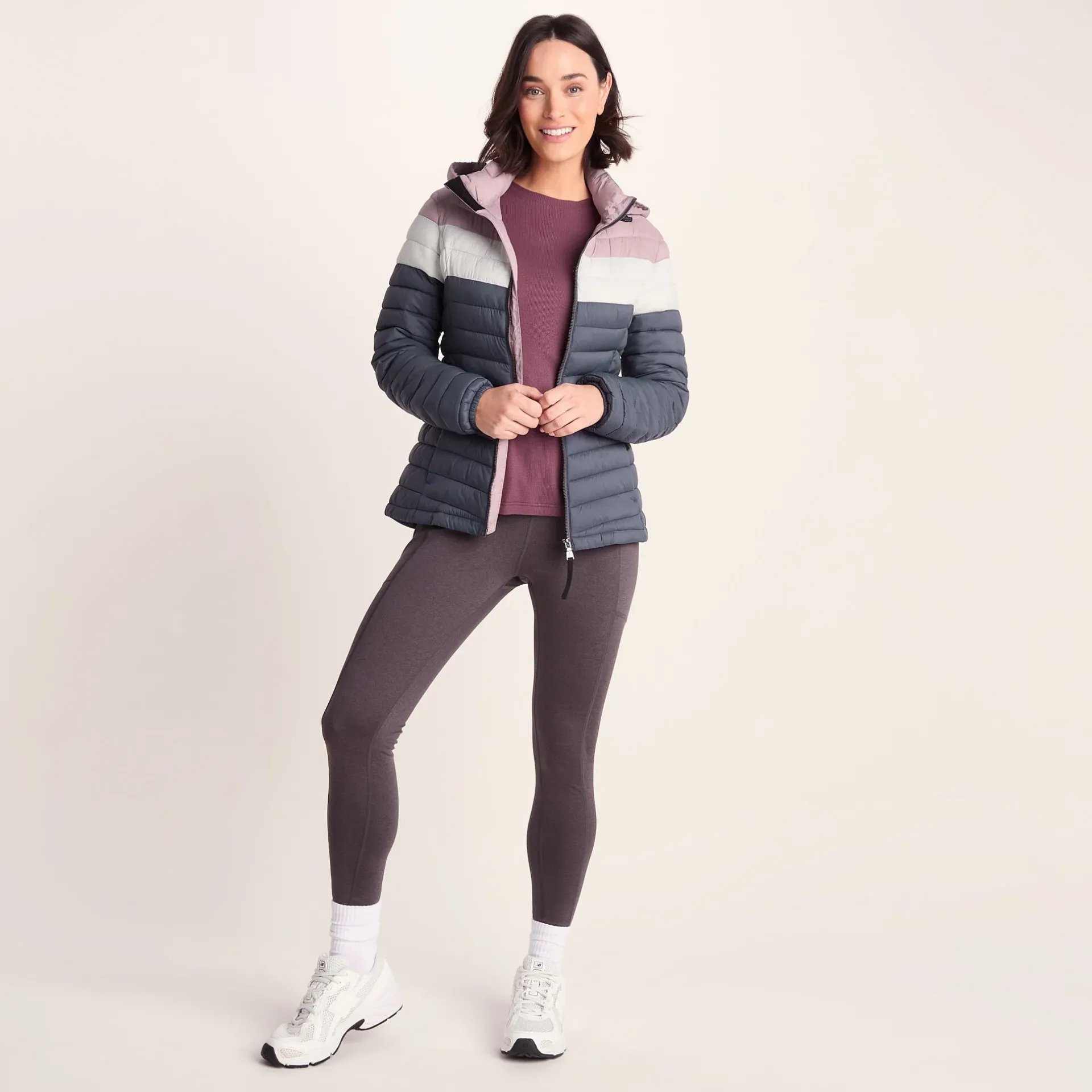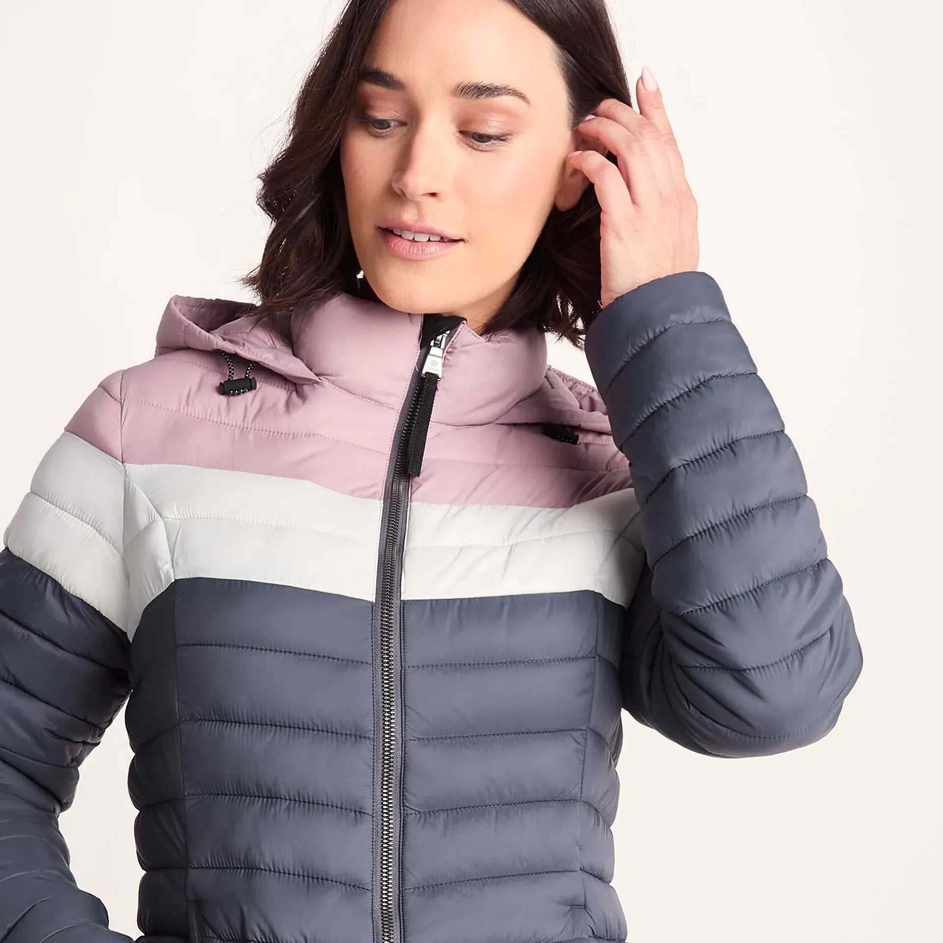 Product DescriptionLightweight, wind resistant and buttery soft, our Garriston quilted jacket gives you warmth without adding bulk and is designed in bold, chevron colour blocks inspired by moorland heather and the churning Atlantic sea. This distinctive and versatile jacket is perfect for travel as it squishes down small and springs back into shape when you need it. The thermal filling is made from recycled plastic bottles, so you’ll be doing your bit to protect the environment too. Garriston has a cosy inner collar for added comfort and a fixed, insulated hood with toggle adjusters. There are two handy zip up pockets and a full length, easy pull zip at the front. The finishing touch is our iconic embossed rubber Yorkshire Rose badge on the sleeve.FeaturesWarm, lightweight and wind resistantQuilted in supersoft materialThermal filling made from recycled plastic bottlesChevron colour block designFull length exposed zip2 lower zip up pocketsInner collar for added comfortInsulated hood with toggle adjustersElasticated cuffsEmbossed rubber TOG24 badge on sleeveFitStudio model Mayara is wearing size 10 and is 5’10