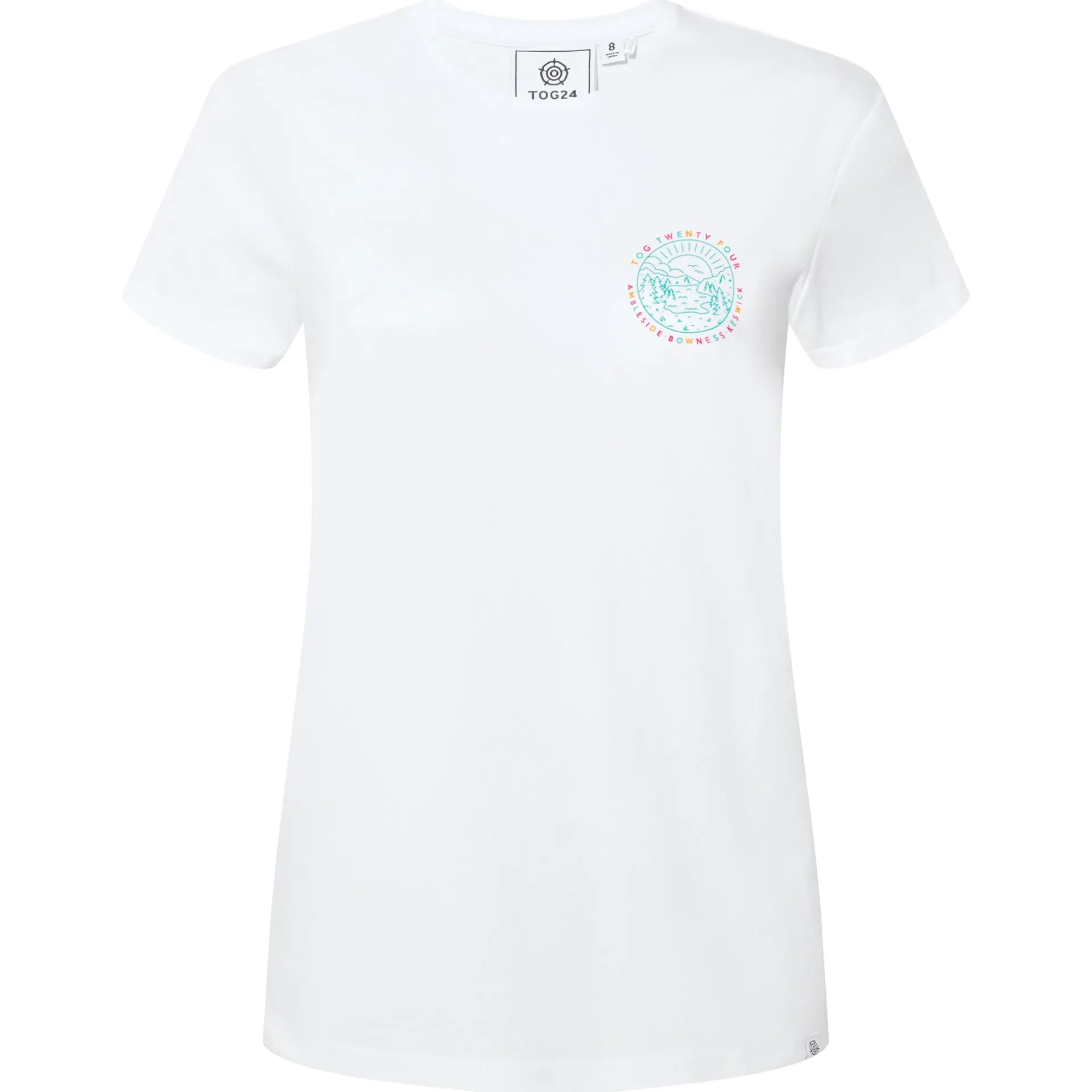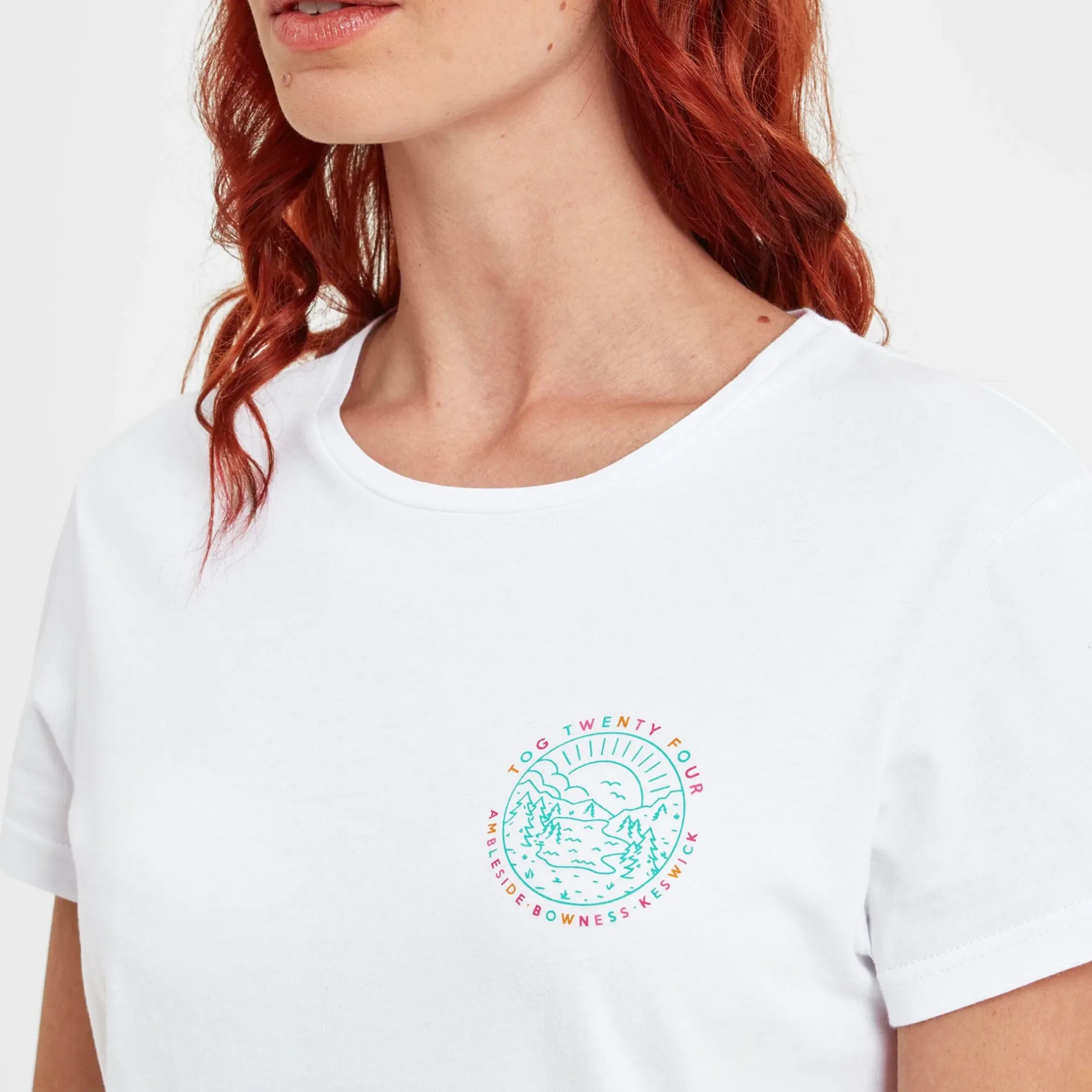 Clearance*This product is excluded from all additional promo code discountsProduct DescriptionCelebrating the charming lakeside towns of Ambleside, Bowness and Keswick, our District women’s crew neck t-shirt proudly displays a small graphic on the chest, with a larger version on the back. These depict the glorious Lake District landscape edged with the name of the towns and TOG Twenty Four printed in jewel colours. District comes in cool and comfortable supersoft 100% sustainable cotton, so it feels as good on as it looks, and it makes the perfect gift for friends and family. Designed by our team based in the beautiful Spen Valley in West Yorkshire with every attention paid to detail, the finishing touch is a small woven TOG24 rose label at the hem.FeaturesSupersoft 100% sustainable cotton short sleeve teeSmall graphic print on chestLarge graphic print on backSmall woven label on hemFitStudio model Emily-Rose is wearing size 8 and is 5’9