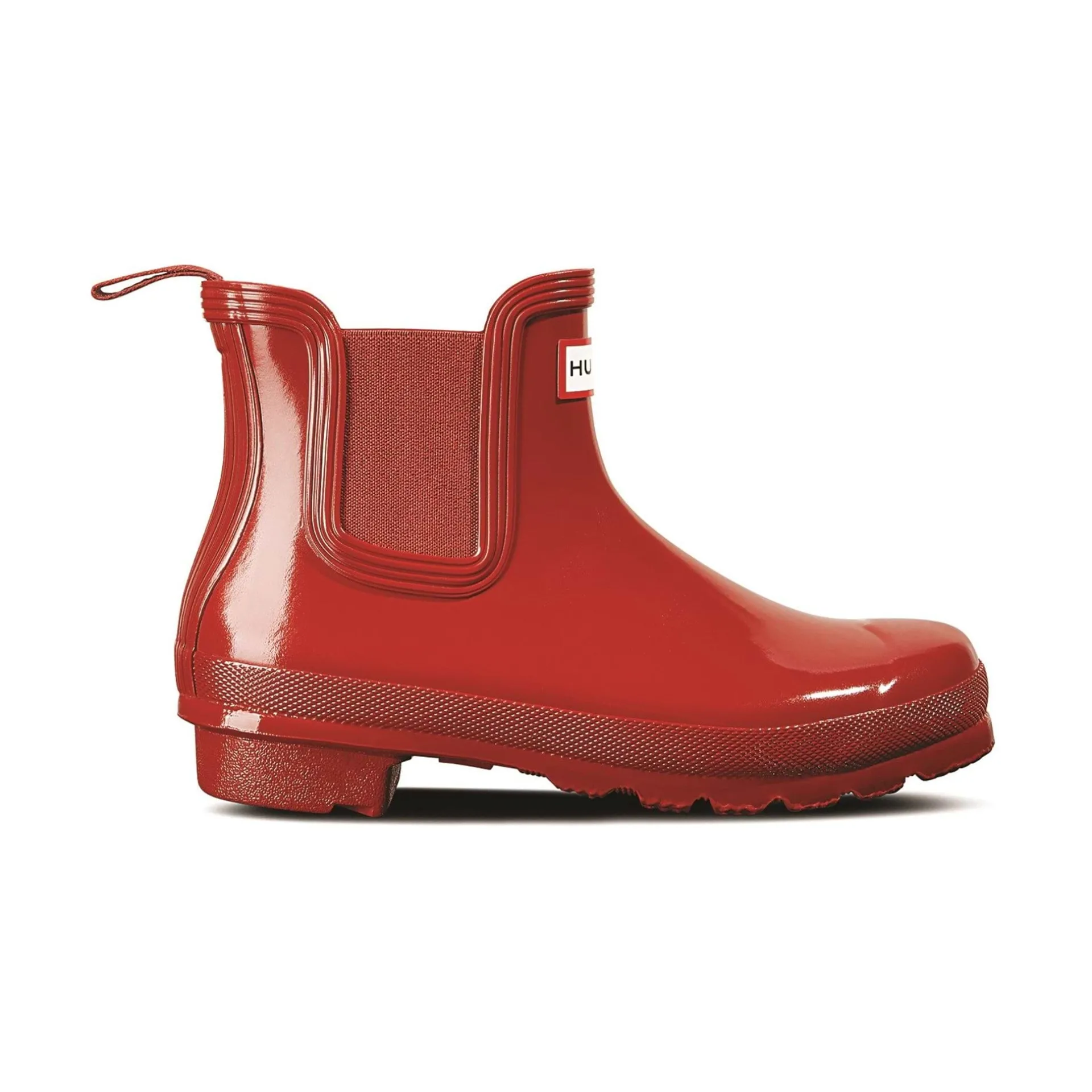 Product DescriptionThe Hunter Original Chelsea Boot has been re-engineered for an improved fit and all-day comfort. A wider ankle circumference, and an increased curve in the heel and around the Achilles tendon delivers an even more comfortable fit.FeaturesTrue to size, Regular fitElasticated-gussetsNylon pull-tabCrafted from natural vulcanised rubber with gloss finishFitMaterial CompositionUpper: Rubber. Lining: Polyester. Sole: Rubber.Care