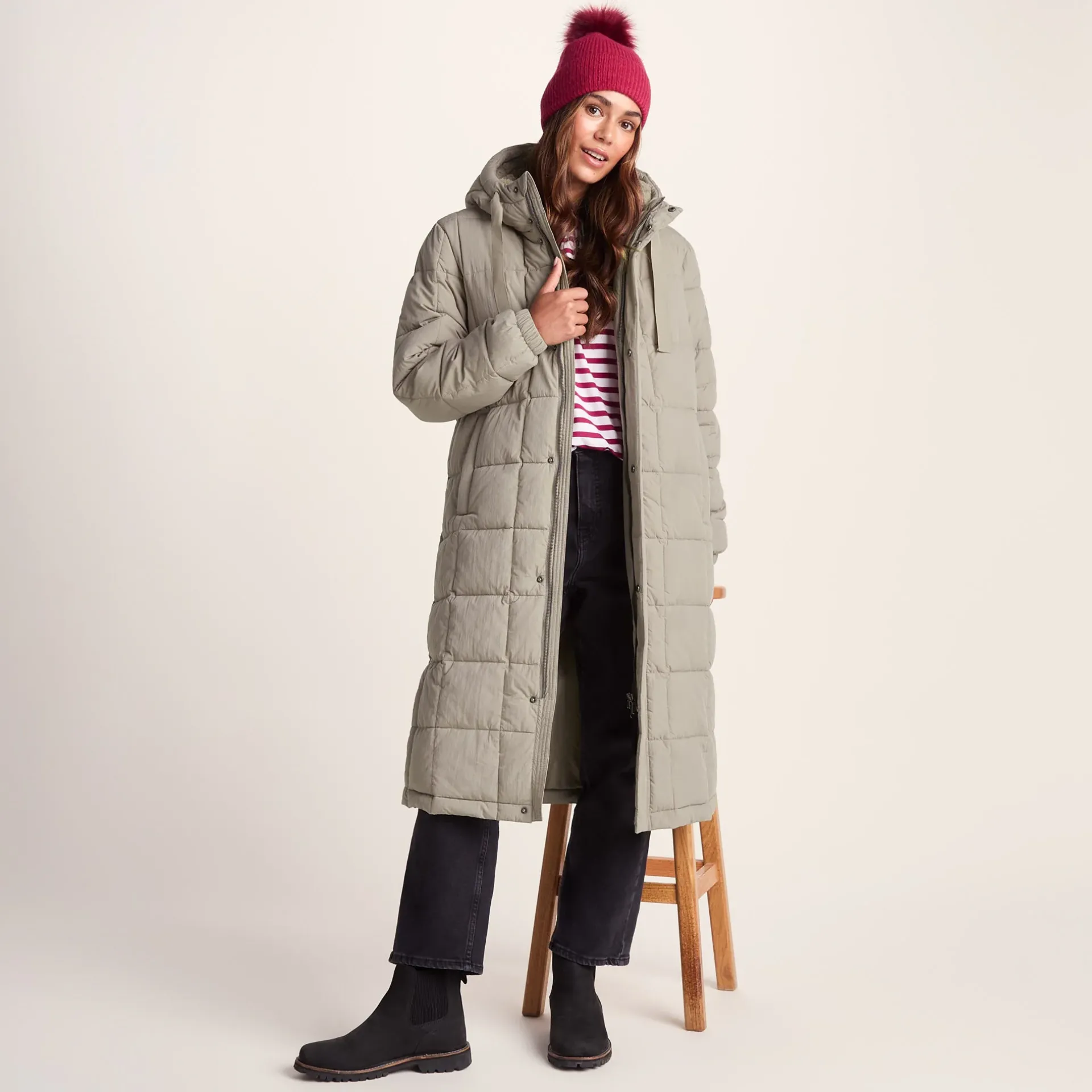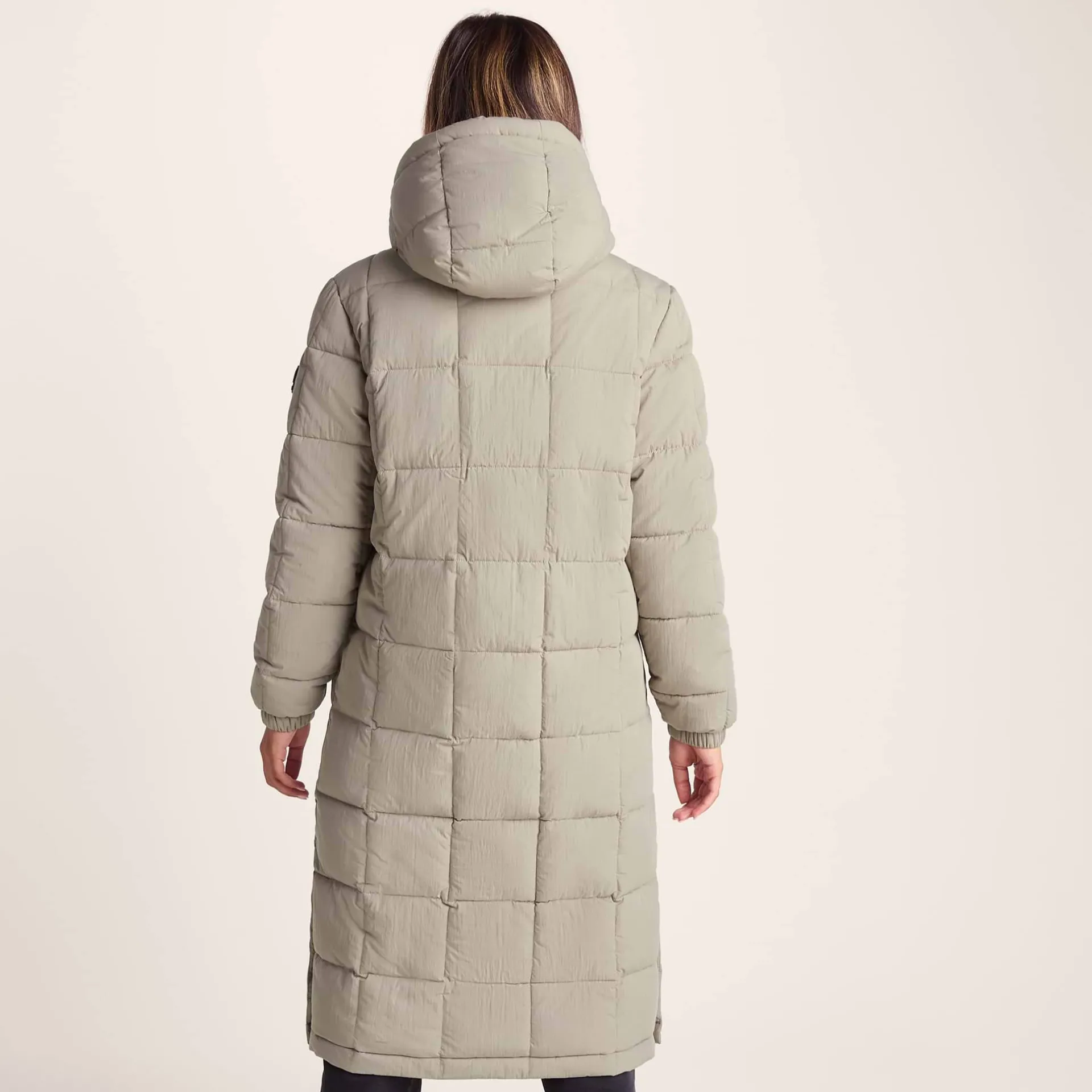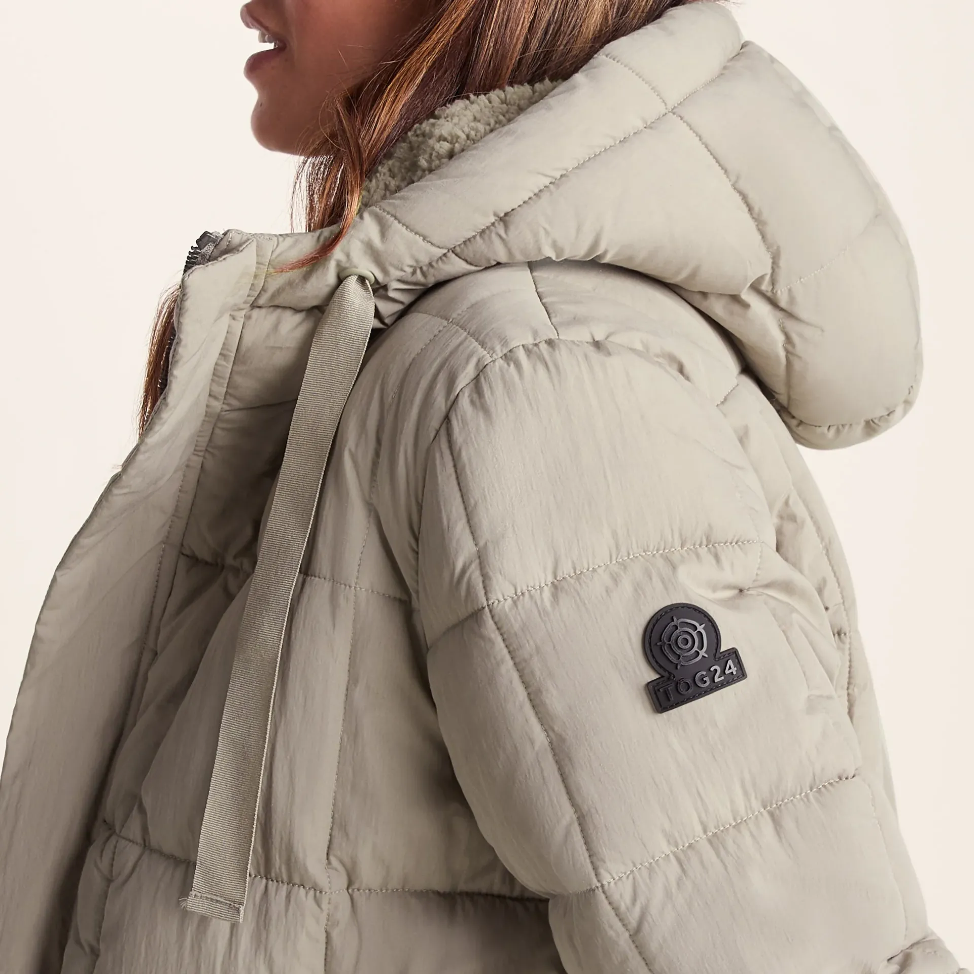 Product DescriptionOn the hunt for the perfect winter coat? The Saga women’s padded coat has you covered – quite literally. Slipping into this jacket is like bundling up in a toasty sleeping bag, giving you that warm, snuggly feeling.nnThe oversized square quilting on this women’s coat is both a strong fashion statement and a strategic way to trap heat precisely where you need it most. A luxurious sherpa lining covers the upper body, wrapping you in the type of warmth that makes braving chilly days feel like a walk in the park.nnWhen the wind picks up, and light rain threatens, you’ll appreciate the water-repellent (DWR) coating on this padded jacket that will keep you dry in light showers. The chunky drawcord hood adjusters mean you can customise the fit so that not even a single cold draught sneaks in, while elasticated cuffs and a two-way zip opening, secured with press studs, offer up triple the protection!nnTwo zip pockets, both lined with soft sherpa, are perfect for warming your cold hands or storFeaturesLight rain protection, wind resistant and warmWater repellent coating (DWR)Square quiltingWarm sherpa lining to upper bodyChunky drawcord hood adjuster2 way zip opening fastened with press studs2 lower zip pocketsElasticated cuffsHem vents with concealed press studsTOG24 embroidery to pocketFitStudio model Narine Dress 6 uk Height 5′ 6½* Bust 32 Waist 24