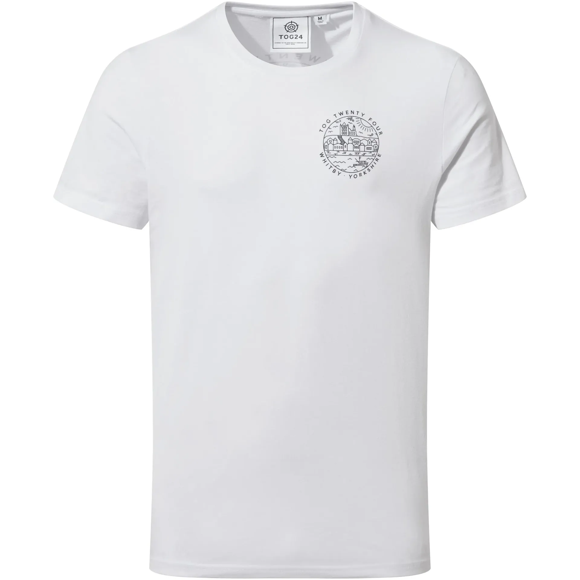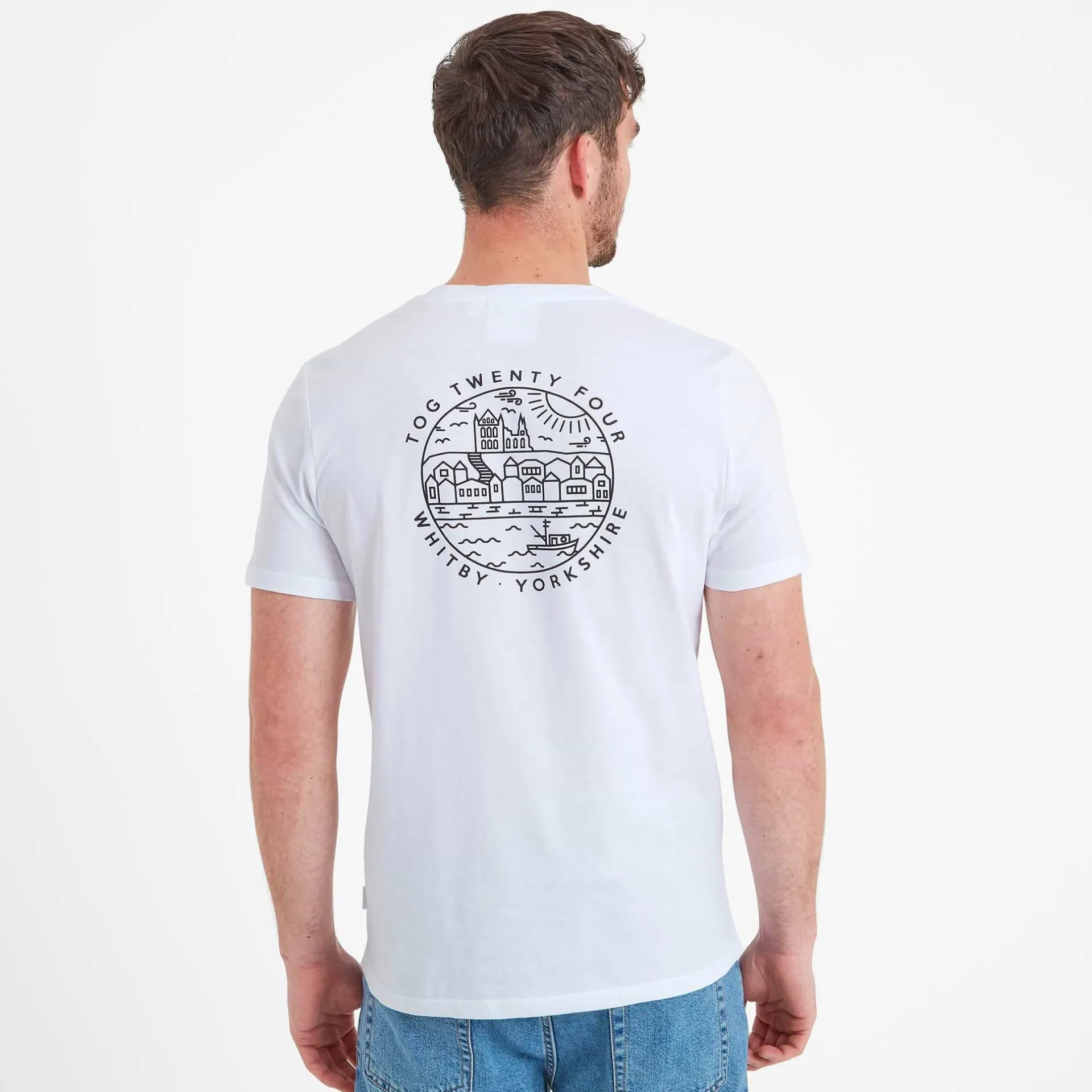 Product DescriptionThe picturesque Yorkshire seaside town is the inspiration for our Whitby men’s crew neck t-shirt. This graphic tee comes in cool and comfy supersoft 100% sustainable cotton and has a comfortable ribbed crew neck, so it feels as good on as it looks. It proudly displays a small graphic on the chest, with a larger version on the back edged with the name of the town and TOG Twenty Four printed in jewel colours.nnWhitby makes the perfect gift for anyone who loves the seaside and it is finished with a small woven TOG24 label on the side seam as a reminder that this t-shirt was proudly designed by our team in West Yorkshire.FeaturesSupersoft 100% sustainable cotton short sleeve teeRib crew neckSmall graphic print on chestLarge graphic print on backWoven label on side seamFitStudio model Joe is wearing size M and is 6’1