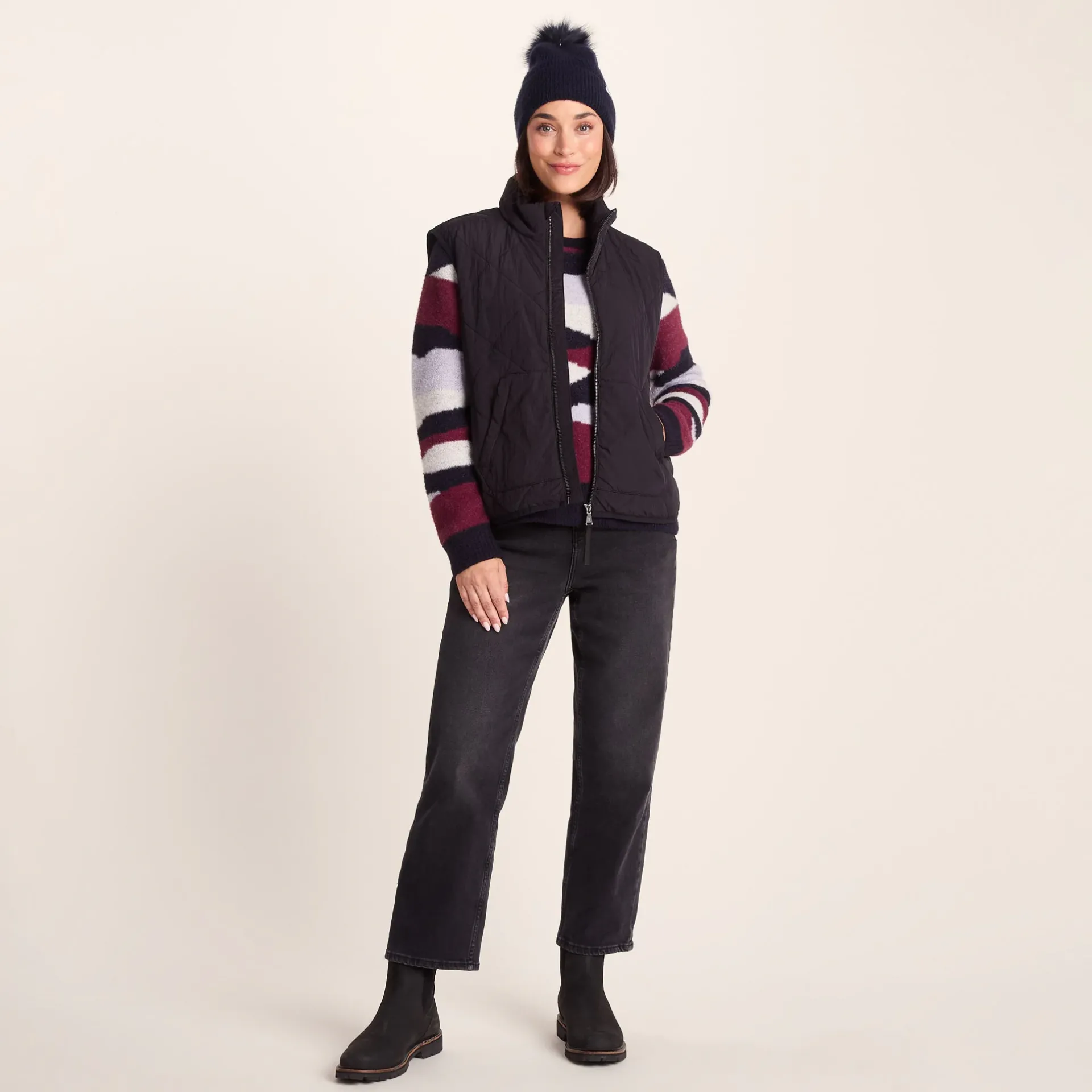 Black November EventGet an extra 15% off this product – automatically applied at checkoutCannot be used in conjunction with any other discountsProduct DescriptionSay hello to Anya knitted hat – your new winter go-to when the cold creeps in. Cosy, comfy and full of charm, this woolly hat is the winter essential you’ll be reaching for on repeat.rnThe chunky ribbed knit hugs your head in gentle warmth, like a hot brew on a frosty morning. The Anya beanie hat keeps the heat in and the chill out no matter what the forecast throws your way, with the turn-up fitting close to your ears for extra warmth where it matters most and holding its shape day after day.rnUp top, a faux fur pom pom brings a bit of cheer to grey skies – because practical doesn’t have to mean boring. Whether you’re mooching around a Christmas market or braving an icy school run, this woolly hat has got you covered.rnFinished with a subtle TOG24 badge on the turn-up, this knitted hat pairs easily with anything in your cold-weather wardrobe. Just pull it on, head out, and let the cold do its worst!FeaturesSupersoft rib knit hatFaux fur pom pomRib turn upTOG24 label on turn upFitStudio model Georgia Dress 8 uk Height 5’10* Bust 34 Waist 25.5